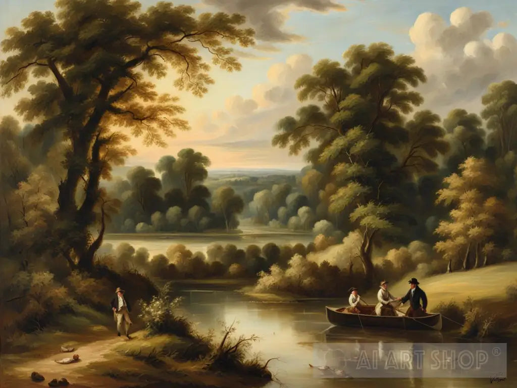 Step into a pastoral dreamscape with these timeless oil paintings reminiscent of the grandeur captured by 19th-century landscape masters like Constable, Turner, and Cole. Each canvas unveils a serene river winding through idyllic countryside, framed by majestic trees casting verdant hues. The azure heavens, adorned with billowing clouds, lend an ethereal backdrop to scenes of tranquil beauty. Amidst this natural splendor, figures from yesteryear meander—ordinary folk, a fisherman, riders on horseback resting along the riverbank. These evocative compositions transport viewers to a gentle bygone era, where nature reigns supreme and time stands still in picturesque harmony.