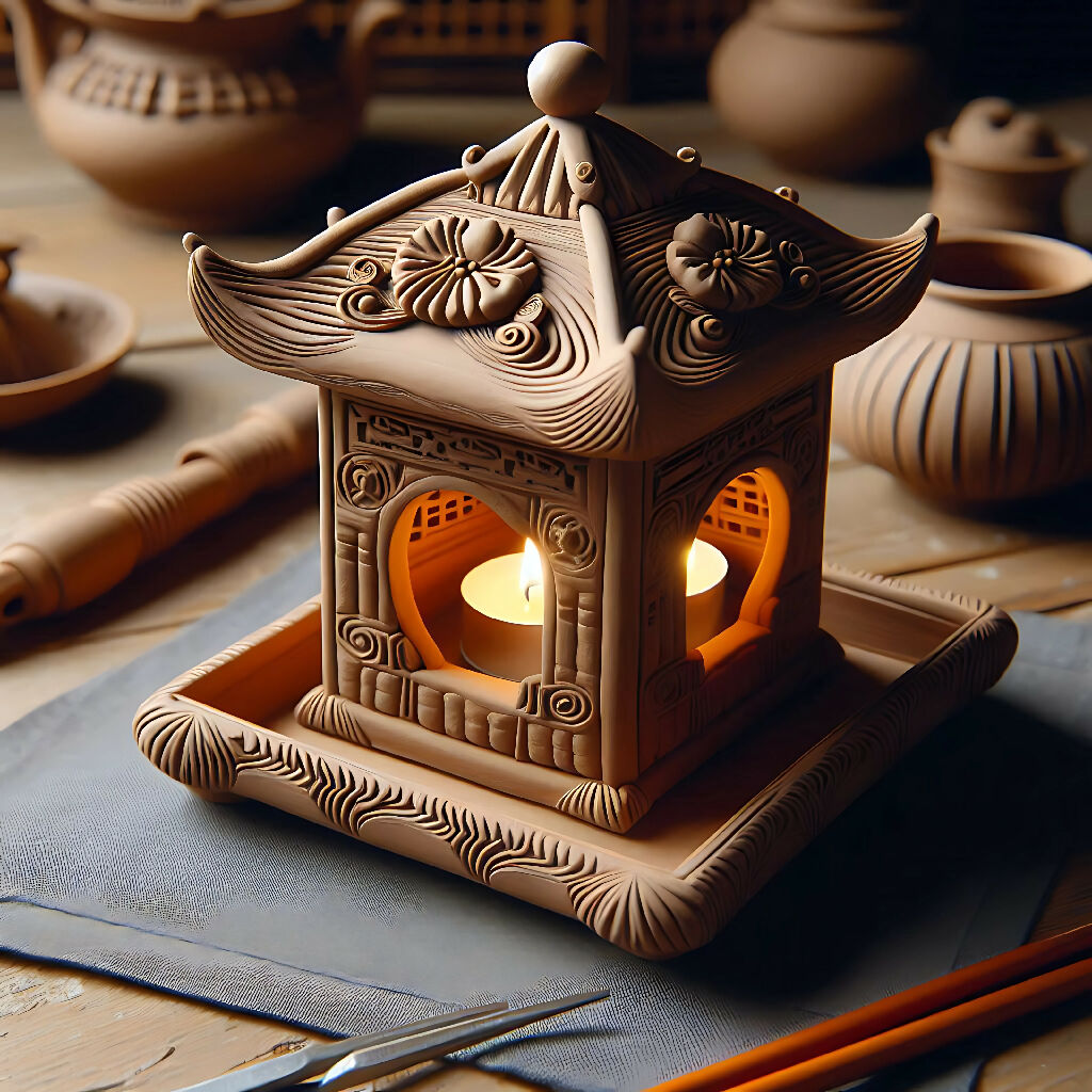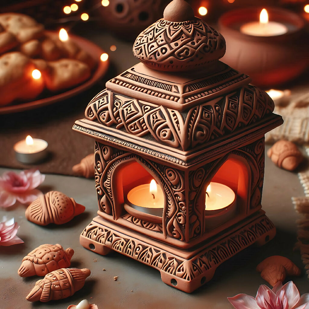 **Clay Lantern**: A decorative lamp to hold candles during nighttime.