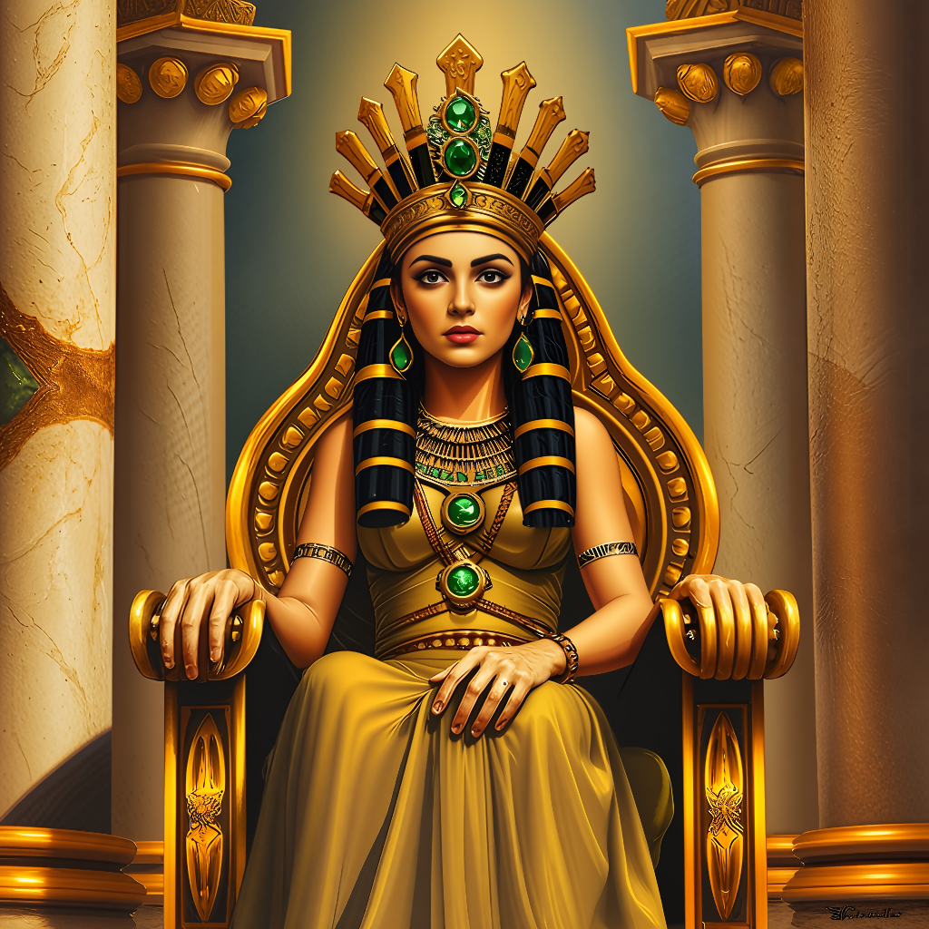 A regal portrait of Cleopatra sitting on her golden throne, adorned with intricate Egyptian jewelry, bathed in the warm glow of torchlight.
