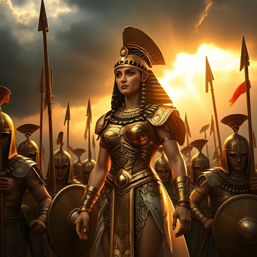 Cleopatra in battle armor, standing tall among her warriors, golden sunlight breaking through storm clouds.