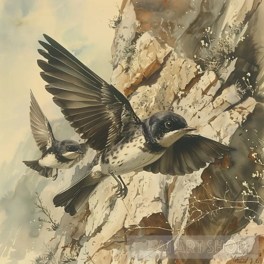 A pair of swifts dynamically soaring past a rugged cliffside. The birds' impressive wing spans are fully extended, displaying the intricate patterns of their feathers.