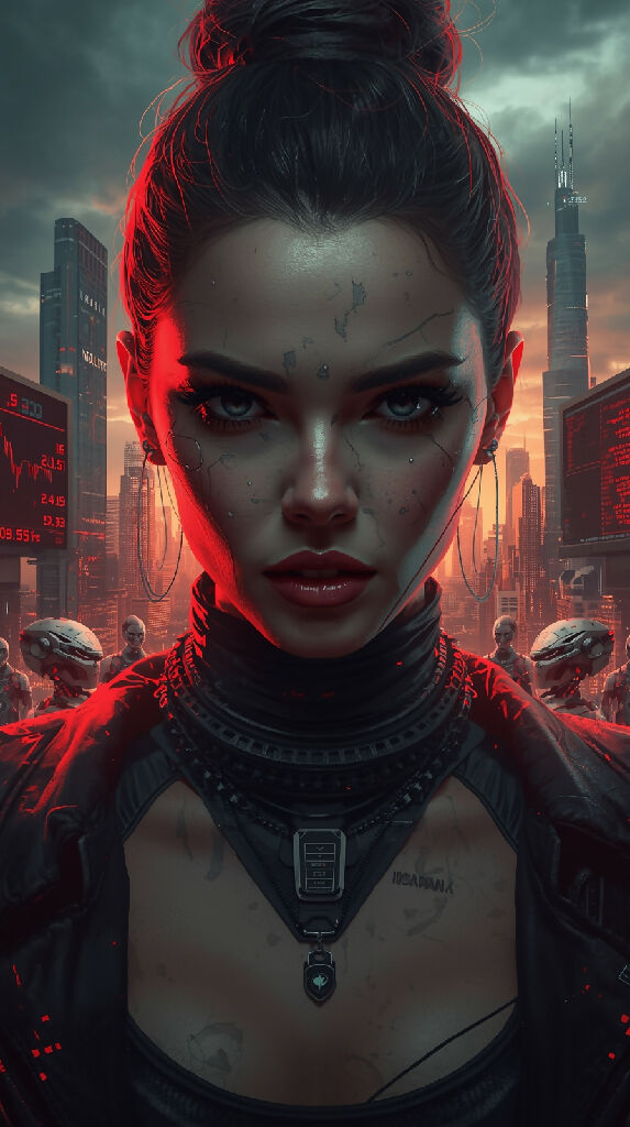 Close-up portrait of a cyberpunk woman matching look & clothes, both mixed with gothic style. Dystopian digital painting representing a future global financial crash. Background: Modern city skyline with futuristic skyscrapers, giant digital stock market screens turning red with numbers collapsing, people in modern clothes looking worried, robots and AI screens flickering, atmosphere apocalyptic with dark skies and a red glow, ultra-realistic cinematic style, futuristic but catastrophic mood.