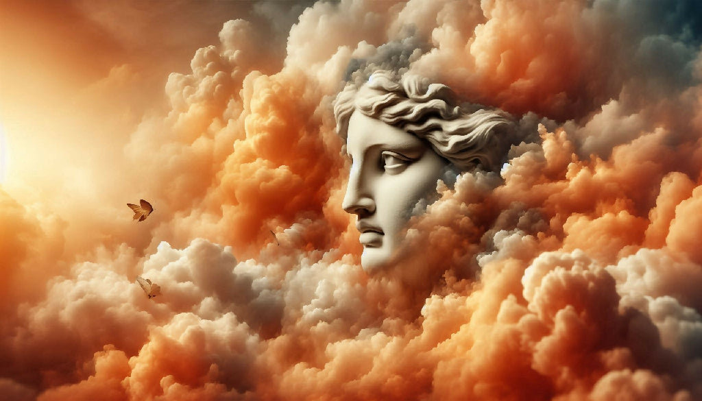A sem-surreal composition of a statuary goddess floating in sunset-hued clouds