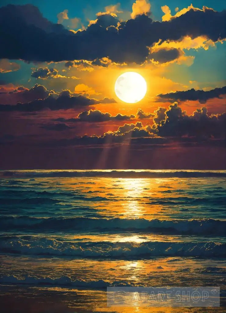Moody moonlight with sun rays filtering through clouds over the ocean pop art.