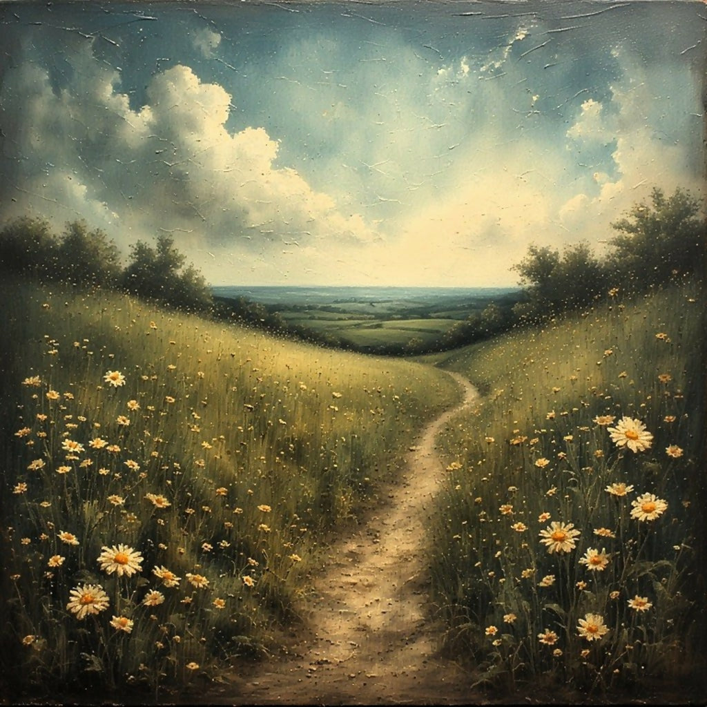 A meandering dirt path invites the viewer into a vibrant meadow, generously dotted with cheerful white daisies.