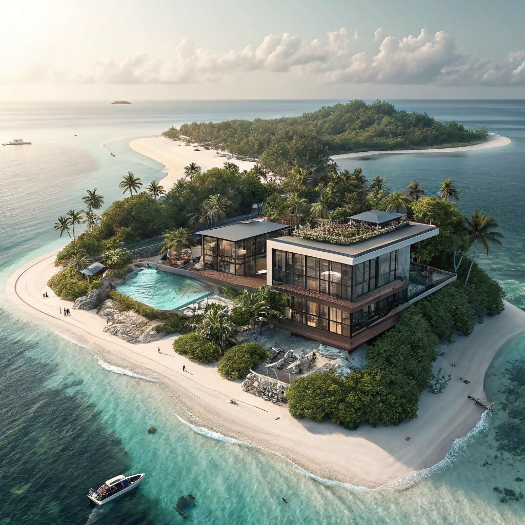 A modern, two-story, architecturally striking house, with dark Gray/Black exterior walls and a flat roof, sits on the island. Large glass windows stretch across some sections of the building. Greenery and vegetation surround the structure, including lush foliage and palm trees clustered around the beachfront.