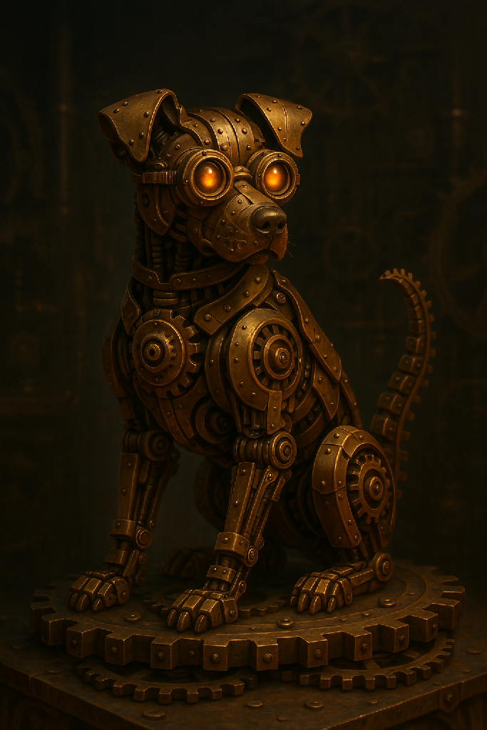 A mechanical steampunk dog, crafted from interlocking gears, pistons, and riveted plates—complete with glowing amber eyes and perched on a gear-laden platform in a softly lit workshop