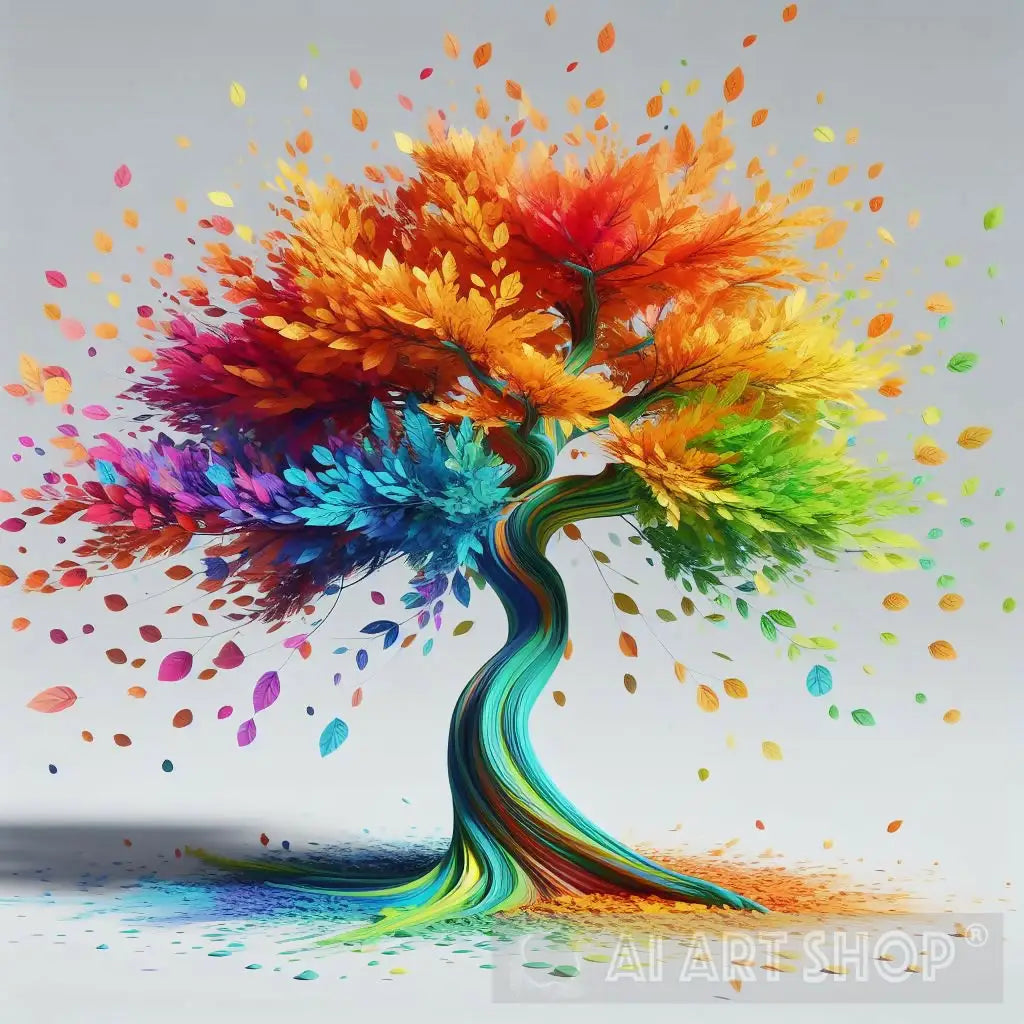 Witness the mesmerizing contrast of this multicolored tree against a blank canvas of white, creating a captivating visual symphony.