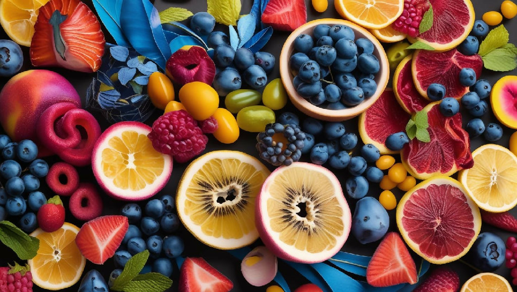 This vibrant and colorful image displays an artistic arrangement of various fruits and berries. It features a rich mix of blueberries, strawberries, raspberries, blackberries, citrus slices (lemon, orange, blood orange), and exotic-looking fruits with vivid colors. Scattered among them are decorative elements like blue leaves and abstract shapes, adding a surreal, eye-catching twist. The overall composition is bold, energetic, and bursting with freshness—perfect for themes related to health, creativity, or tropical aesthetics.