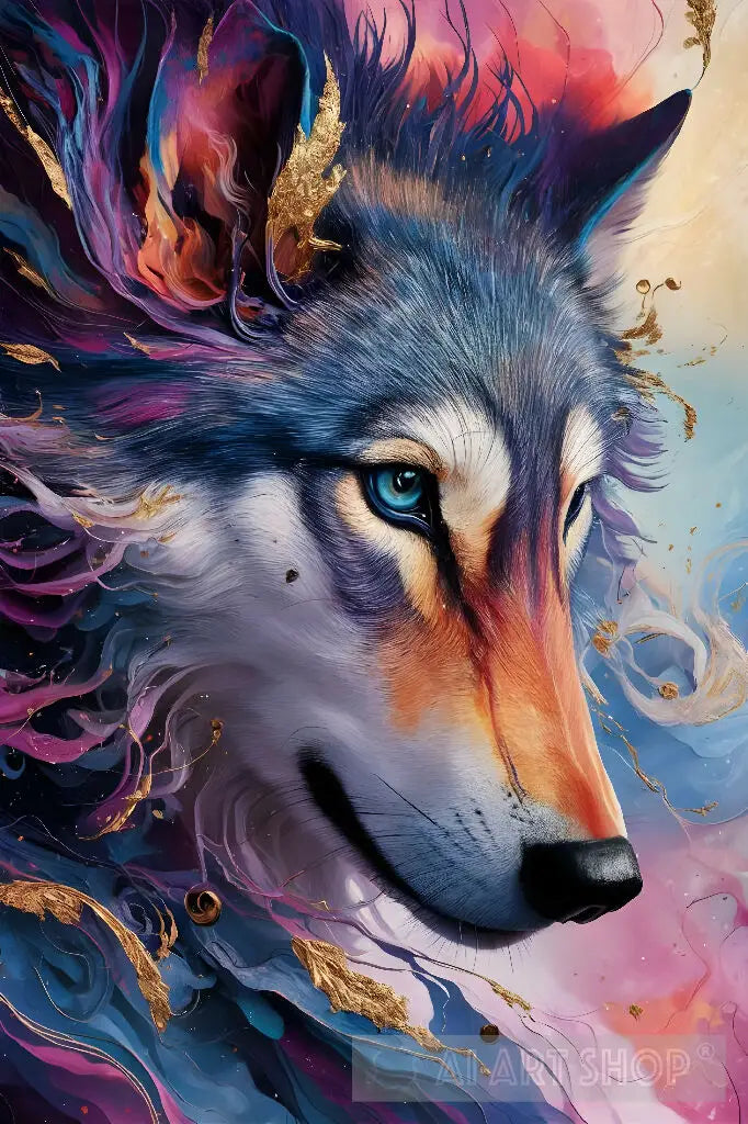 A vibrant and intricate portrayal of a wolf's face. The wolves eye is prominently displayed, with a deep blue hue and a swirl of colors surrounding it. The fur appears fluid and abstract, with a blend of purples, blues, and oranges. Gold accents, possibly representing ornate details, are scattered throughout the image. The background is a blend of soft pastels with hints of pink, blue, and yellow, creating a dreamy and ethereal atmosphere. The painting is vibrant