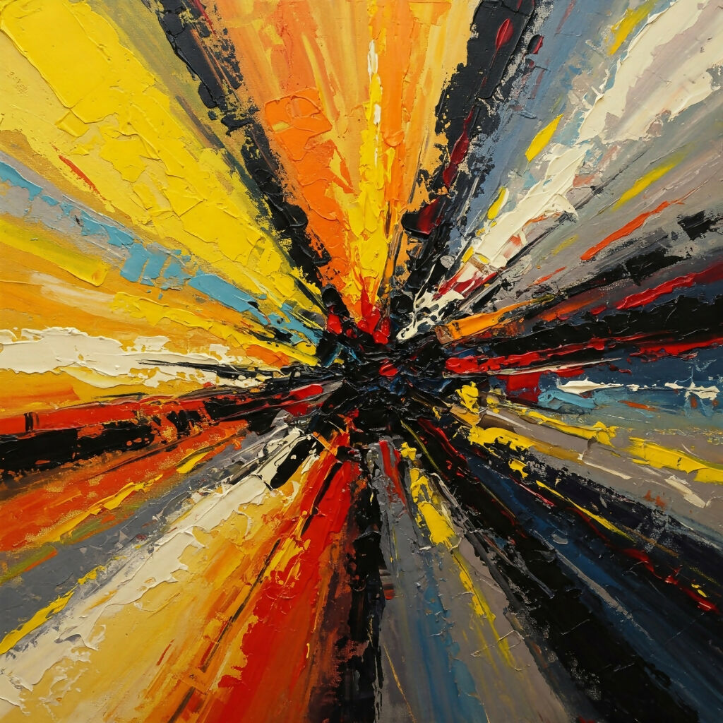 - التركيب والتقنية: تبدو ضربات الفرشاة فضفاضة ومعبرة، مع نسيج واضح وطبقات من الطلاء. هناك مناطق من الصبغة السميكة والغسلات الرقيقة، مما يُضفي ديناميكيةً شاملة. يفتقر التركيب إلى أشكال تمثيلية واضحة، ويركز بدلاً من ذلك على تفاعل اللون والخط والملمس. هناك شعور بالحركة والانفجار، حيث تشع الخطوط والألوان إلى الخارج وعلى طول القماش.