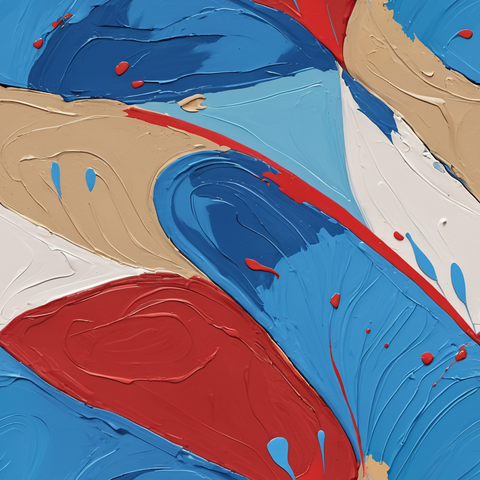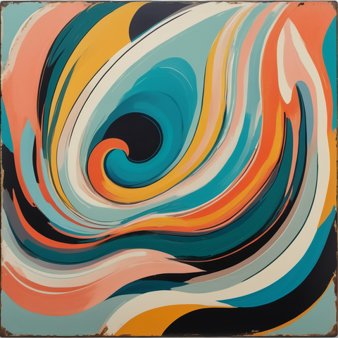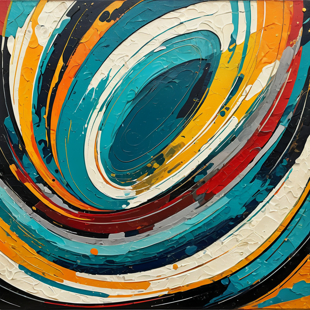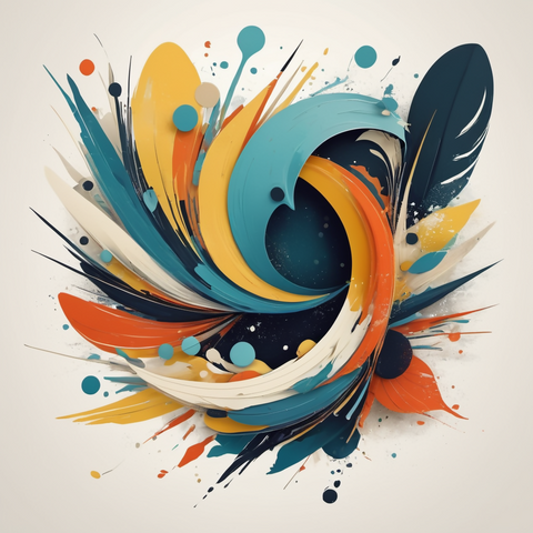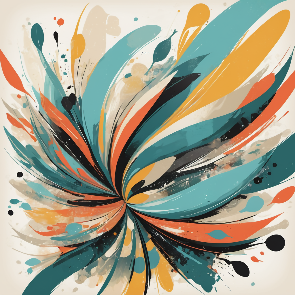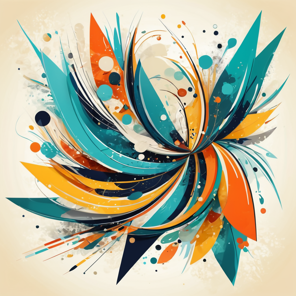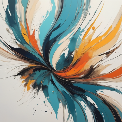 A dynamic and vibrant abstract artwork featuring an explosion of curved shapes and splashes in turquoise, orange, yellow, navy blue, and beige tones. The design gives a sense of motion and energy, with flowing lines and paint splatters creating a visually striking composition. Perfect for modern wall art, digital prints, or graphic design inspiration.