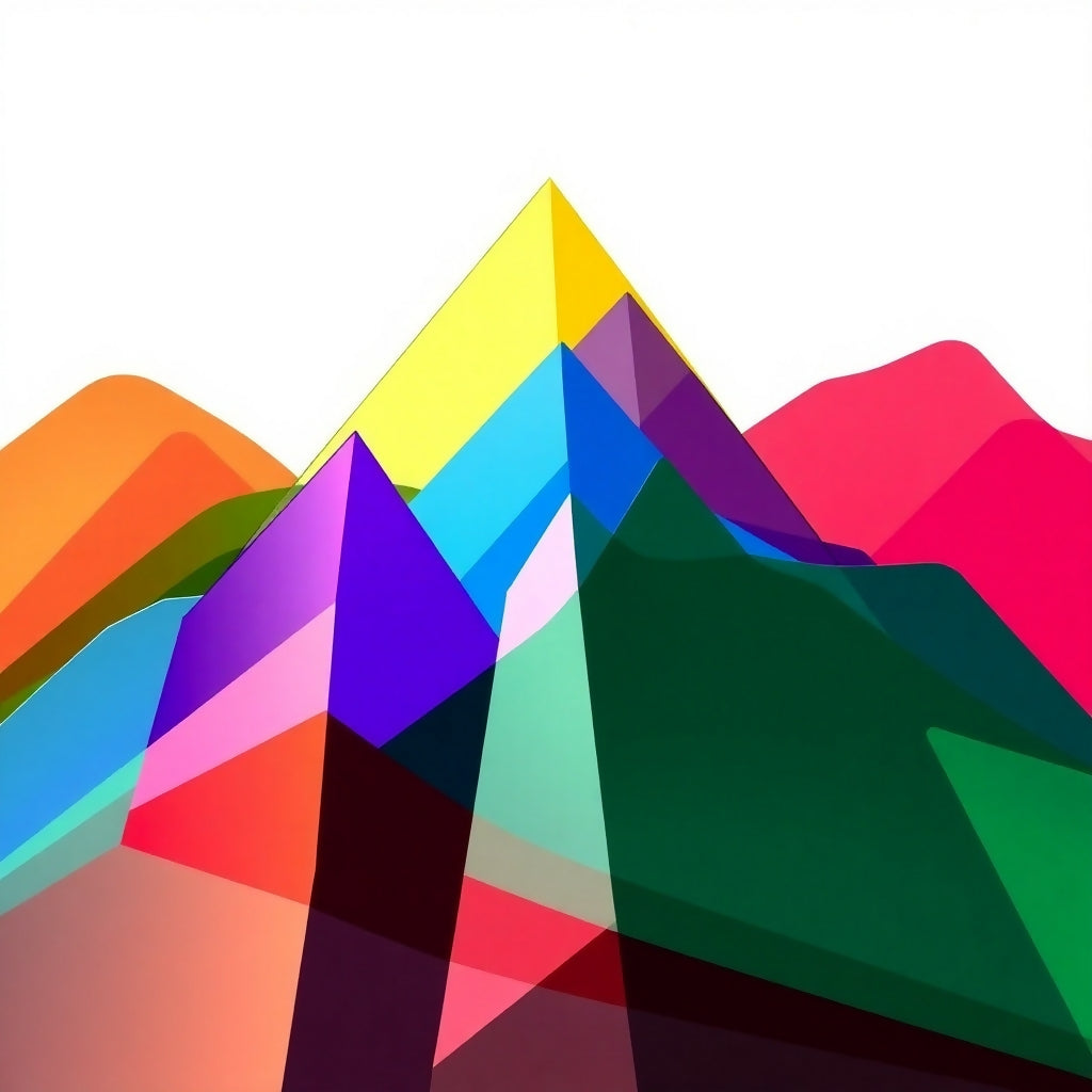 Vibrant abstract mountain landscape composed of overlapping geometric shapes in bold colors - yellow, orange, pink, purple, blue, and green. The minimalist design features translucent layered triangular peaks creating a modern, eye-catching composition with depth and dimensional appeal.