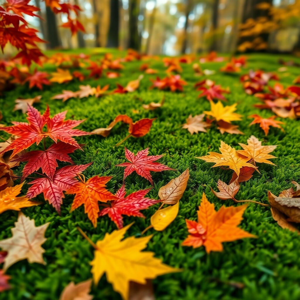 Beautiful fall scene featuring vibrant maple leaves in shades of red, orange, yellow, and brown scattered across verdant green grass. The shallow depth of field creates a dreamy bokeh effect with blurred trees in the background, capturing the essence of autumn's transformation and nature's stunning seasonal display.
