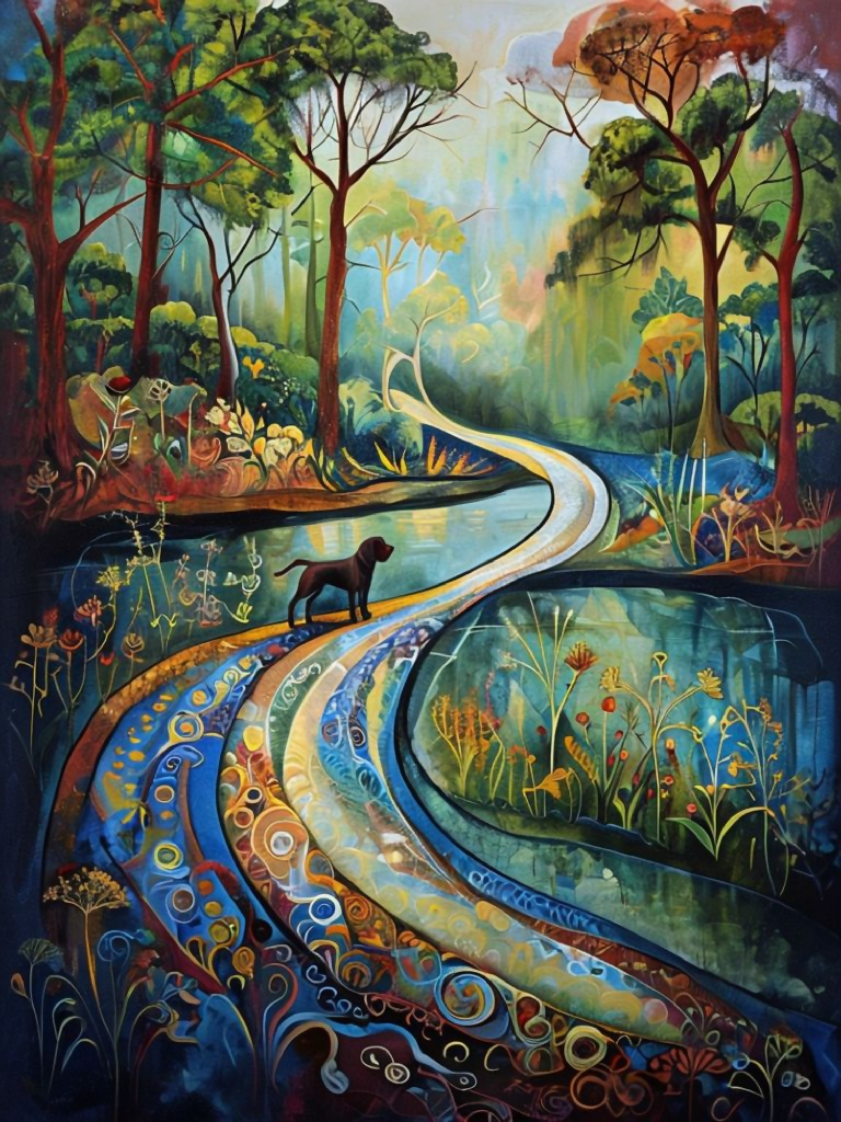 Embark on a visual journey with this vibrant dog and colorful path digital art print, a whimsical forest landscape painting that adds an enchanting touch to any space. This high-quality digital illustration features a charming dog (reminiscent of a labrador or retriever) on a mesmerizing, swirling, colorful pathway winding through a lush, dreamy forest. Rendered in a unique abstract landscape style with rich, vibrant colors, it's perfect for nature-inspired home decor and pet lover gifts.