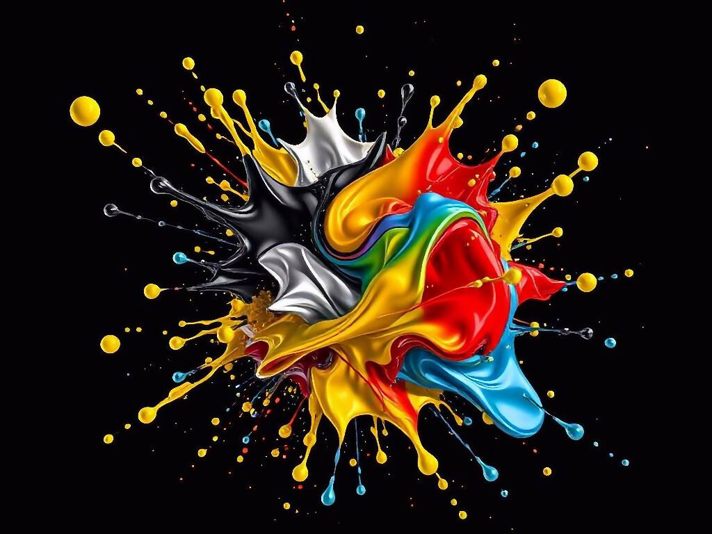 A vibrant work of art that plays with colorful, dynamic splashes of color. The composition represents an explosion of colors that interact with each other in a cheerful and energetic interplay. The background is kept in a neutral tone to highlight the bright colors.  Overall, this artwork exudes a joyful energy and creativity that draws the viewer in and inspires amazement. It invites you to explore the variety of colors and the dynamics of the composition and to enjoy the joy of art.