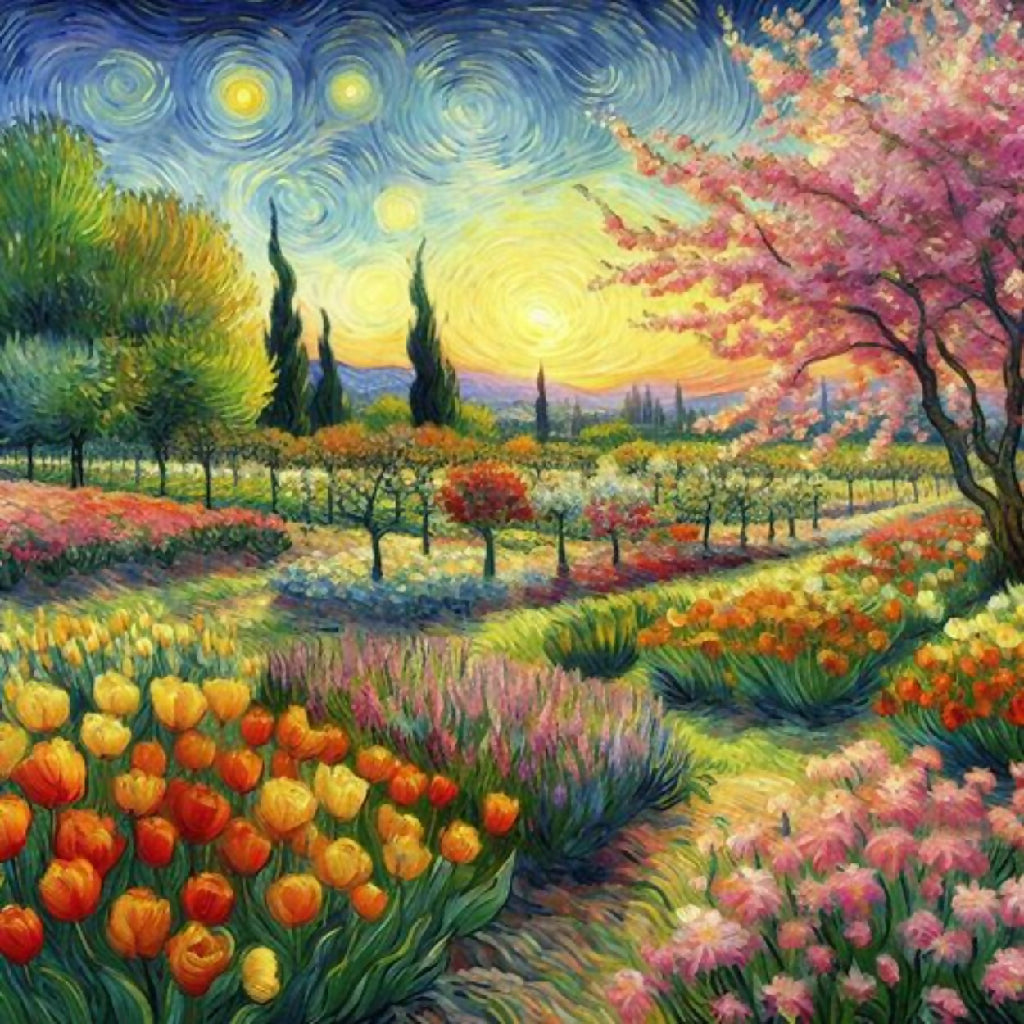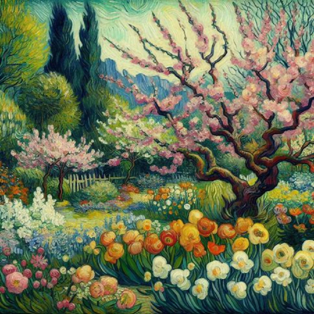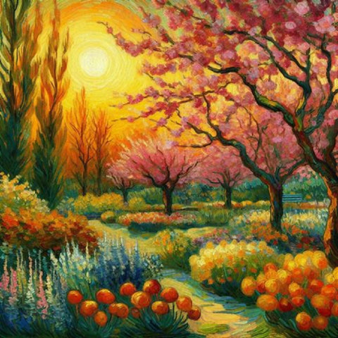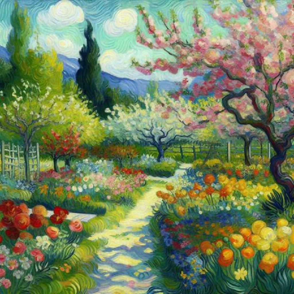 This image depicts a vibrant and enchanting garden scene, characterized by a winding pathway that meanders through lush greenery and an abundance of colorful flowers. The path is flanked by blooming trees with pink blossoms and various flowering plants in shades of red, yellow, blue, and white. The background features rolling hills and a serene sky with swirling clouds, adding depth and movement to the composition. The overall style is reminiscent of impressionistic art, with bold brushstrokes and a lively use of color that creates a sense of joy and tranquility.