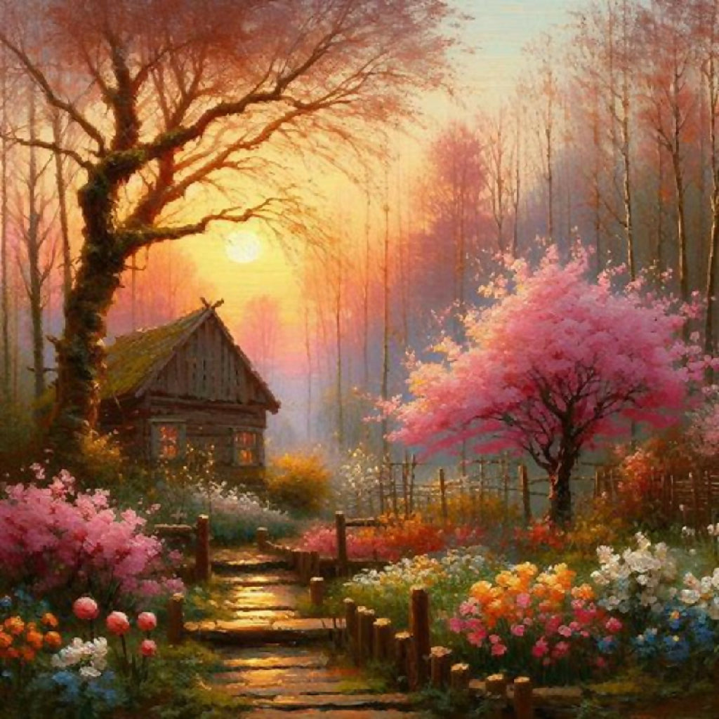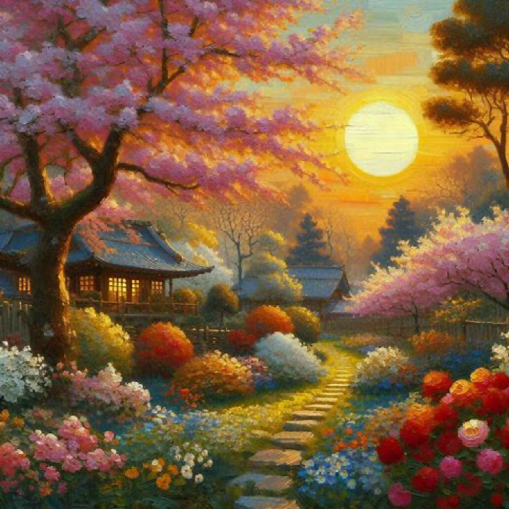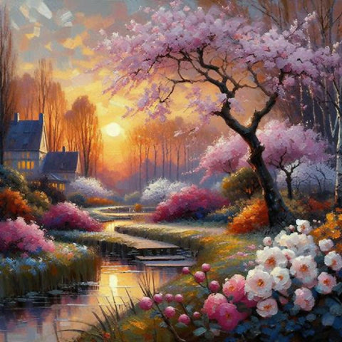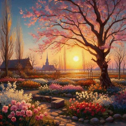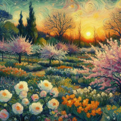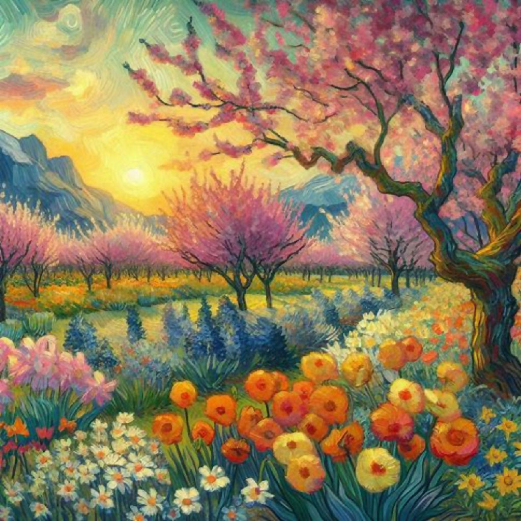 This image depicts a vibrant and enchanting garden scene, characterized by a winding pathway that meanders through lush greenery and an abundance of colorful flowers. The path is flanked by blooming trees with pink blossoms and various flowering plants in shades of red, yellow, blue, and white. The background features rolling hills and a serene sky with swirling clouds, adding depth and movement to the composition. The overall style is reminiscent of impressionistic art, with bold brushstrokes and a lively use of color that creates a sense of joy and tranquility.