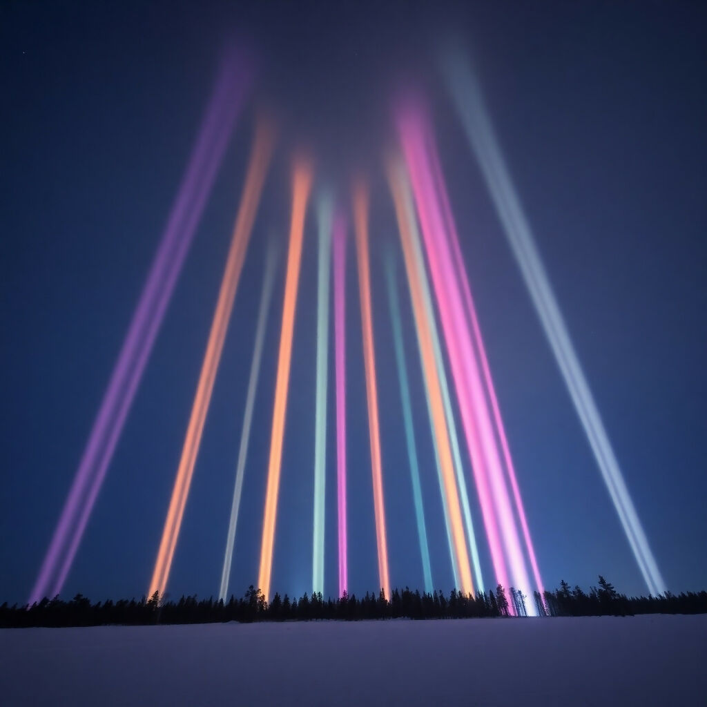 Spectacular light pillar phenomenon with vibrant multicolored vertical beams stretching skyward from snowy landscape. Pink, purple, orange, and blue luminous columns create a surreal natural light show above forest silhouette, captured in this stunning winter night atmospheric display.