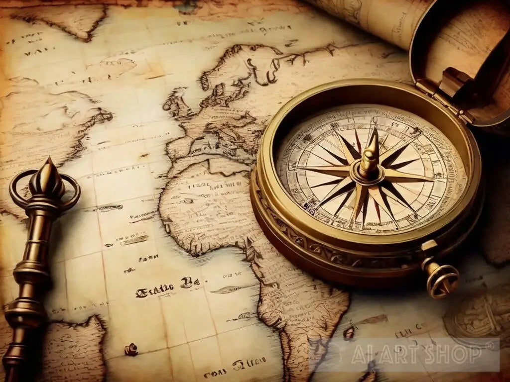 Columbus day and world map with compass. Treasure manuscript