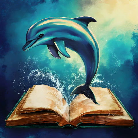 A visually stunning and vibrant vector art illustration of a dolphin jumping out of an open book. The dolphin is rendered in a realistic style, while the book has a vintage and slightly worn appearance. The background is a rich, oceanic blue with soft, sunlit waves. The overall effect is both whimsical and enchanting, creating a magical connection between the world of literature and the oceanic realm., vibrant, painting.