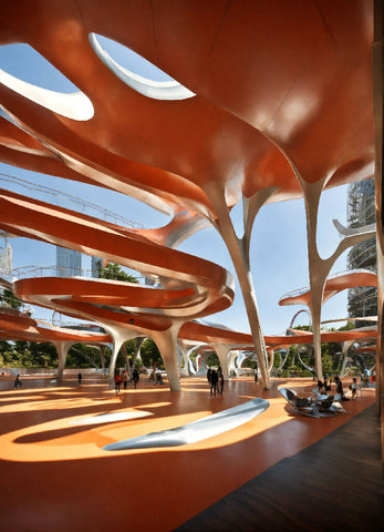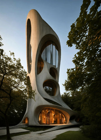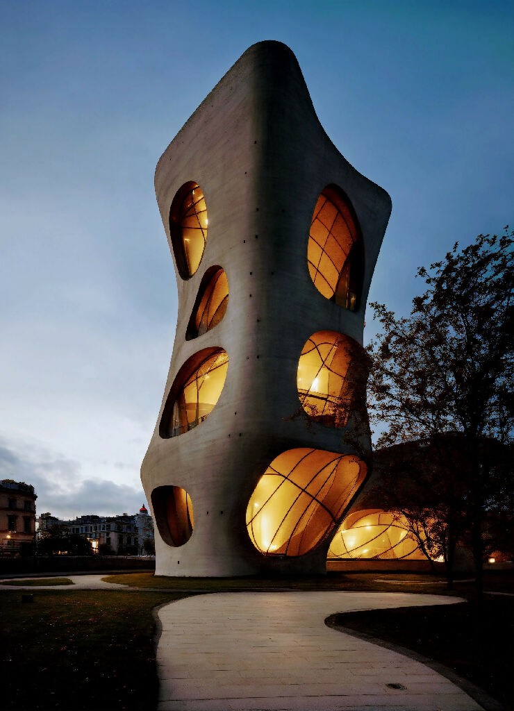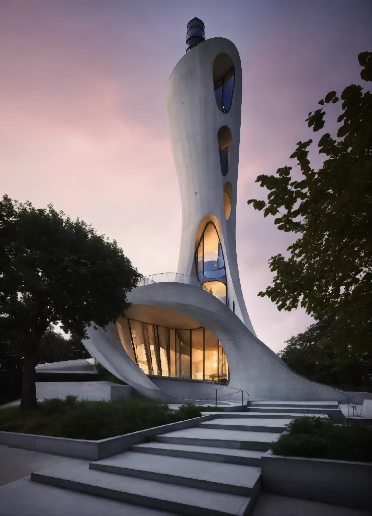This architectural marvel reimagines the traditional lighthouse, fusing functionality with avant-garde design. Rising amidst the urban landscape, the concrete lighthouse serves as both a guiding symbol and a striking sculpture. Its sculptural form defies conventional geometry, with sweeping curves, sharp angles, and dynamic lines that appear to deflect the surrounding environment. The rough, industrial texture of the concrete contrasts with the sleek glass elements, creating a bold visual juxtaposition.