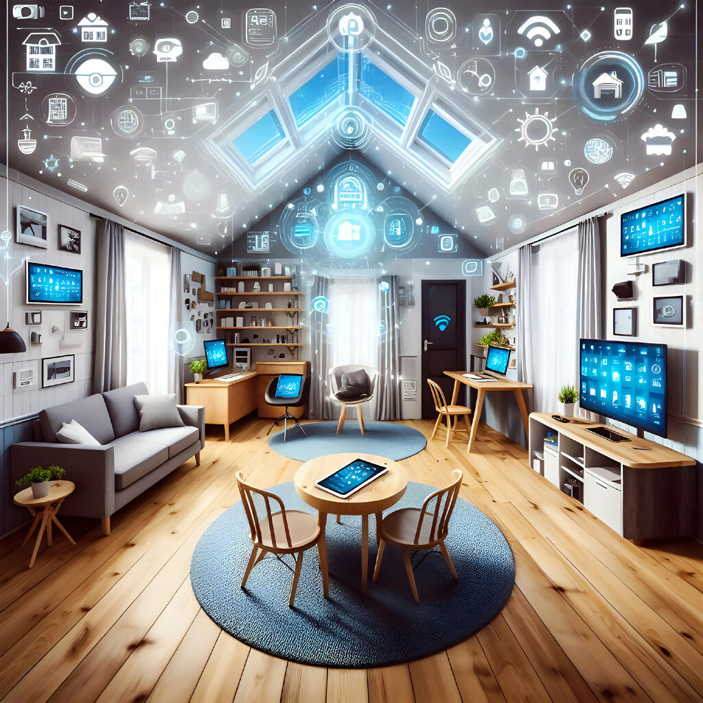 Step into the future with Connected Living: Smart Home Symphony, a visually captivating AI-generated artwork that celebrates the elegance of modern technology. This piece showcases a stylish interior where smart devices, digital interfaces, and ambient lighting converge in perfect harmony. From cloud-connected controls to sleek furniture and glowing overlays, every detail reflects the seamless integration of tech into everyday life.