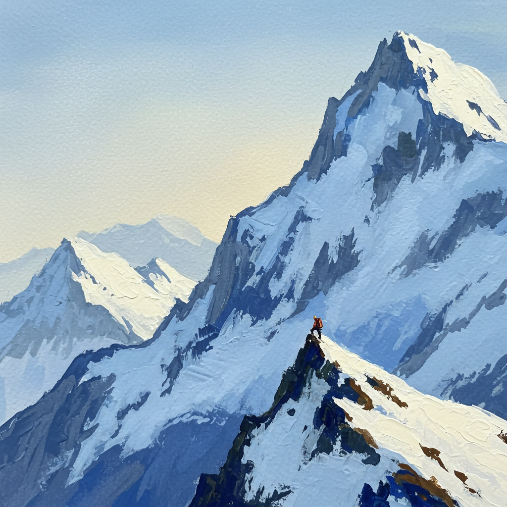 Brushstrokes and Texture: The thick and expressive strokes, reminiscent of oil or acrylic painting, vividly convey the texture of the snow and the ruggedness of the mountain.