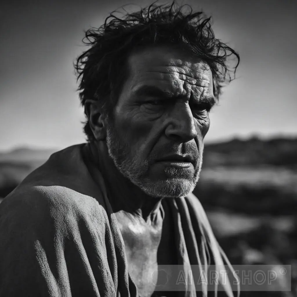 "Contemplations of the Wild" captures the spirit of survival and introspection. This AI-generated portrait art features a man whose face tells a story of resilience and contemplative life journeys. Set against the backdrop of a harsh and unforgiving landscape, the portrait embodies the raw essence of nature and human experience intertwined.