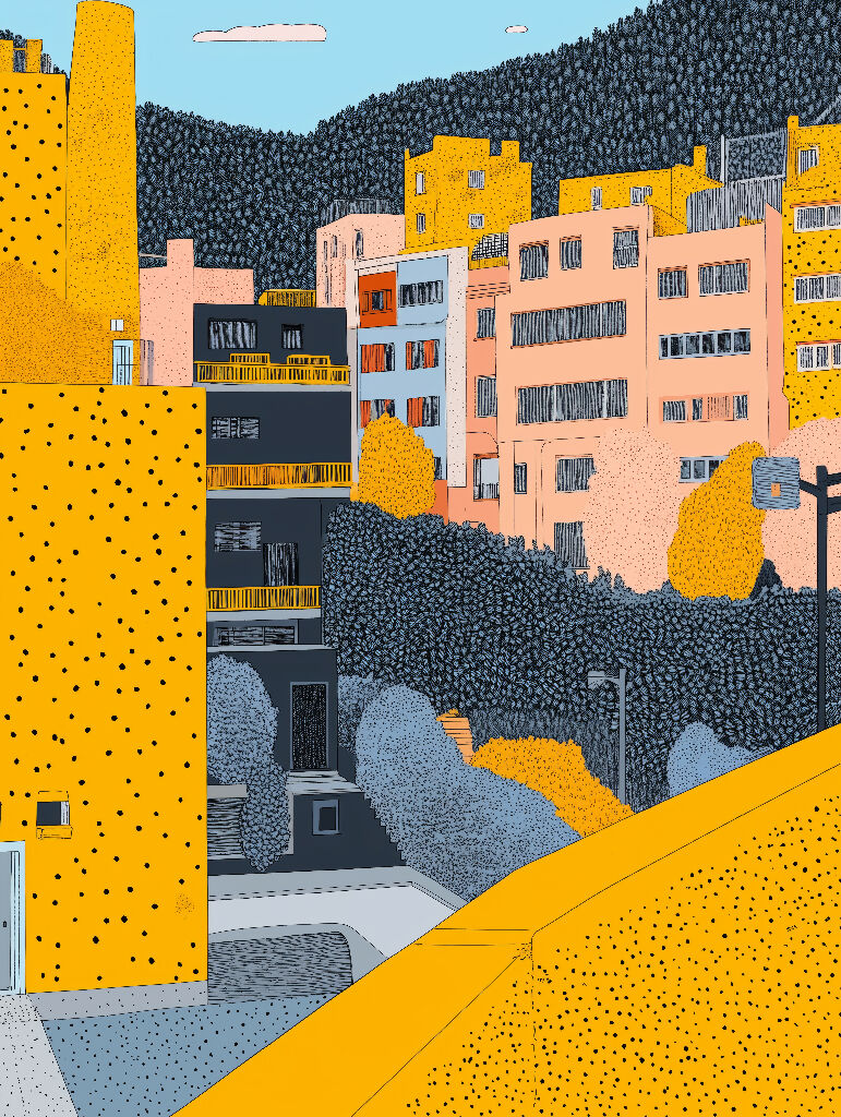 Each building bursts with warm oranges, soft pinks, and deep graphite hues, creating a perfect balance between geometry and emotion. This piece captures the soul of contemporary architecture — structured, vivid, and full of life.