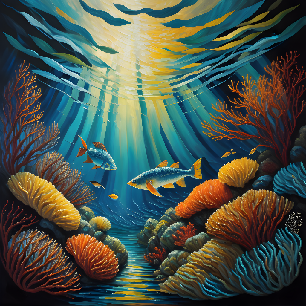 the brightly colored highly textured coral. Little sea-life gather together as brightly colored tropical fish swim by. Light shines down through the beautiful blue sea.