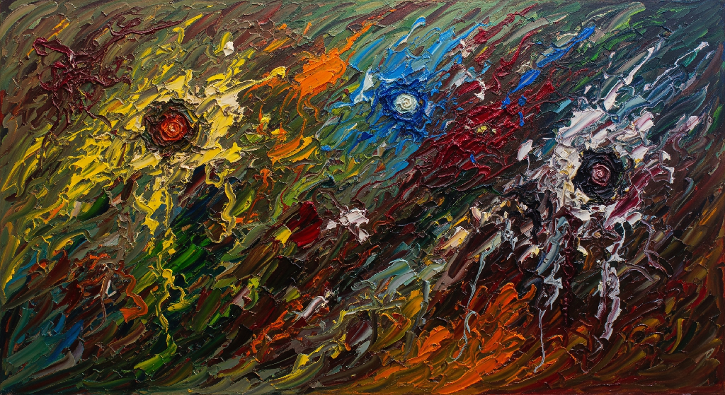 Corruption and Decay. The clean, almost hopeful yellow on the left is how it starts, sun-like yellow form with a deep red core seems to be bursting forth, inside you. Then it evolves, gives way to the increasingly violent and messy textures of the blue and red zones, culminating in the bleak, dark chaos on the far right. The strokes themselves mimic the violent and destructive nature of decay. The bright yellows and blues are systematically overwhelmed by murky browns, deep reds, and black, reinforcing the theme of corruption. The final state is not a peaceful end but a state of chaotic disintegration, a powerful statement on the nature of decay as a process of deconstruction rather than simple disappearance; they consume you.