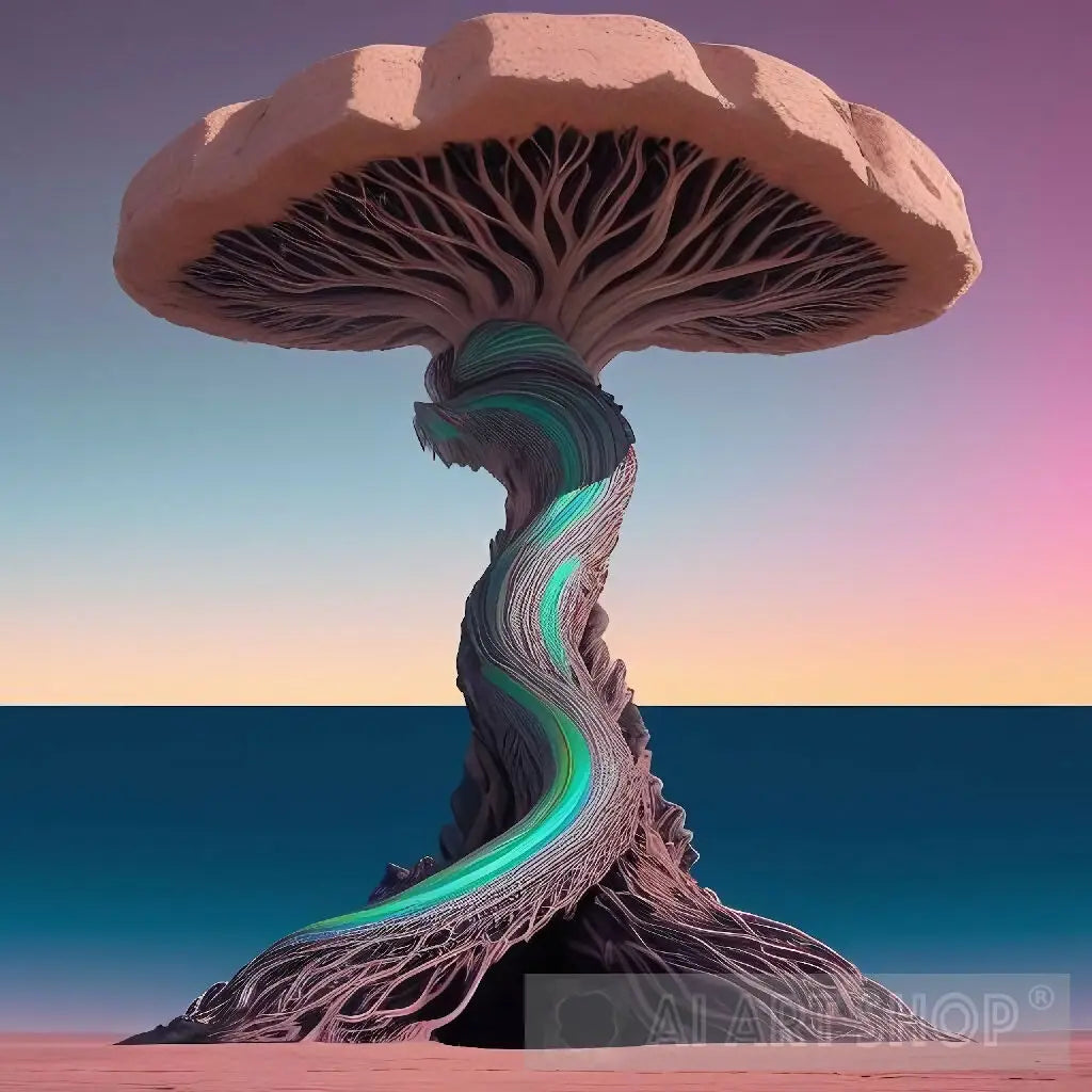 "Cosmic Arboreal Apex: Echoes of Desolation" captures the haunting beauty of an alien-like tree tower reaching towards the heavens amidst a barren and desolate landscape. This artwork embodies the juxtaposition of life and death, as the towering structure stands as a solitary beacon of resilience in a vast, empty expanse, hinting at both the majesty and the melancholy of existence beyond our understanding.