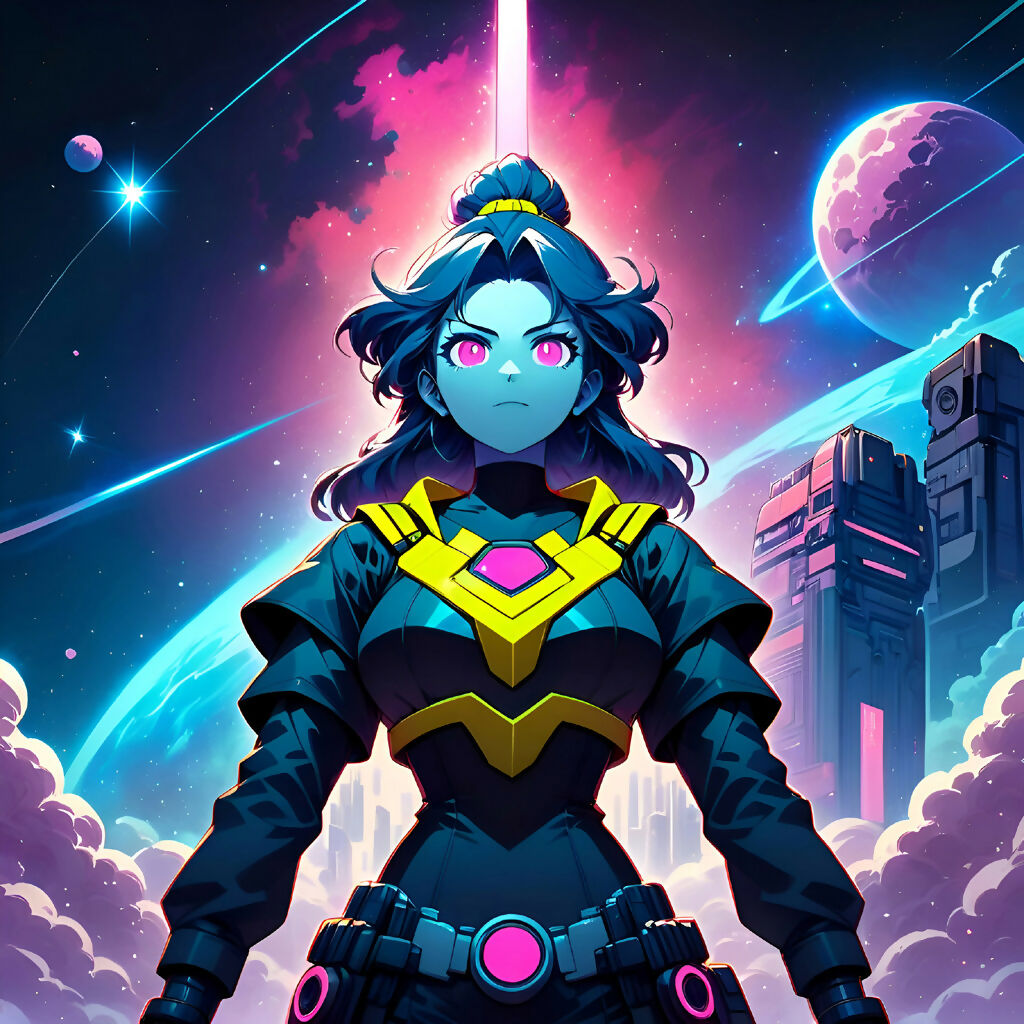 Step into a surreal universe where technology and mysticism collide. Cosmic Ascension: Neon Sentinel of the Stars portrays a fearless intergalactic guardian, her glowing eyes and radiant armor pulsing with cosmic energy. As a beam of light erupts from her crown into the heavens, she channels the power of forgotten galaxies to protect the balance of space-time. Set against a backdrop of swirling nebulae and futuristic cities, this artwork invites viewers to imagine a world where celestial warriors rise from stardust to defend the unknown. Perfect for lovers of sci-fi, fantasy, and surreal heroism.