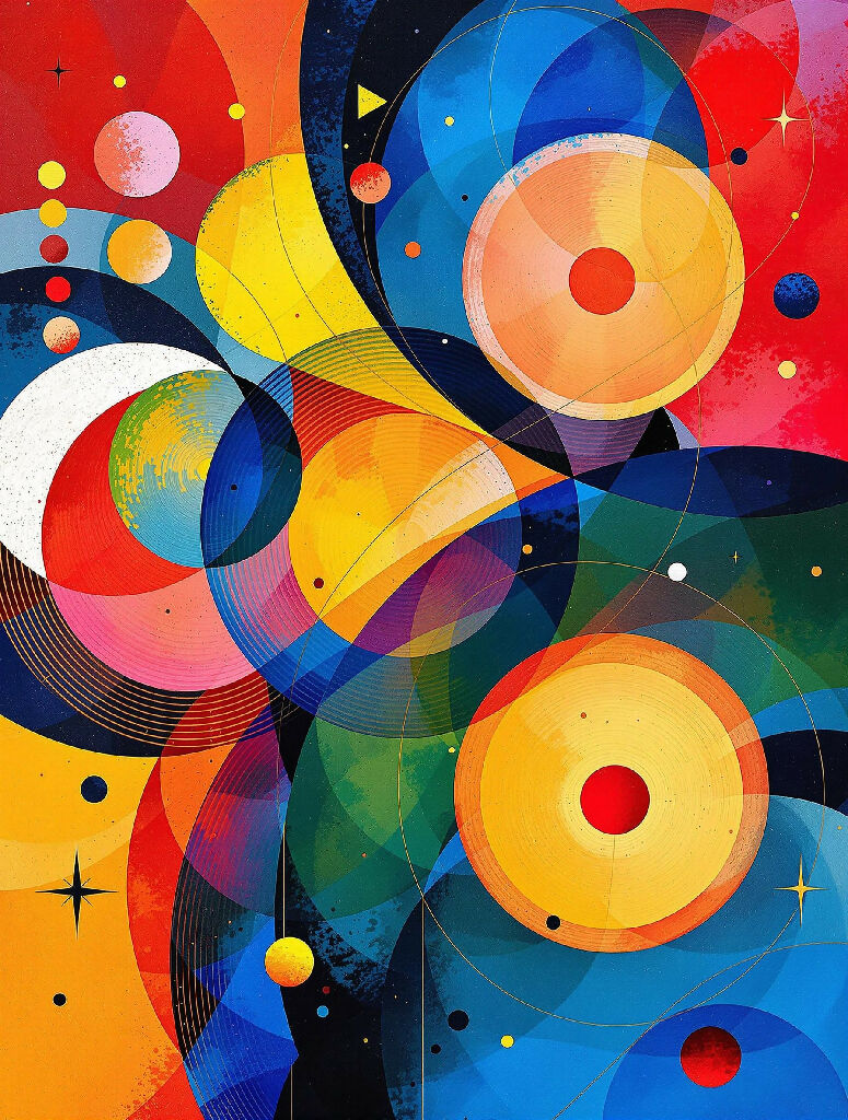 This digital artwork features a vibrant abstract composition of circles and geometric shapes. Brightly colored disks, including red, yellow, blue, and green, overlap and intertwine, creating a sense of movement and depth. The circles, some with textured details like concentric lines, evoke celestial bodies or waves of energy. Dots and stars add a cosmic touch to the scene, while thin gold lines connect the different shapes. The whole is bathed in a colorful background, where each area seems to radiate its own light.