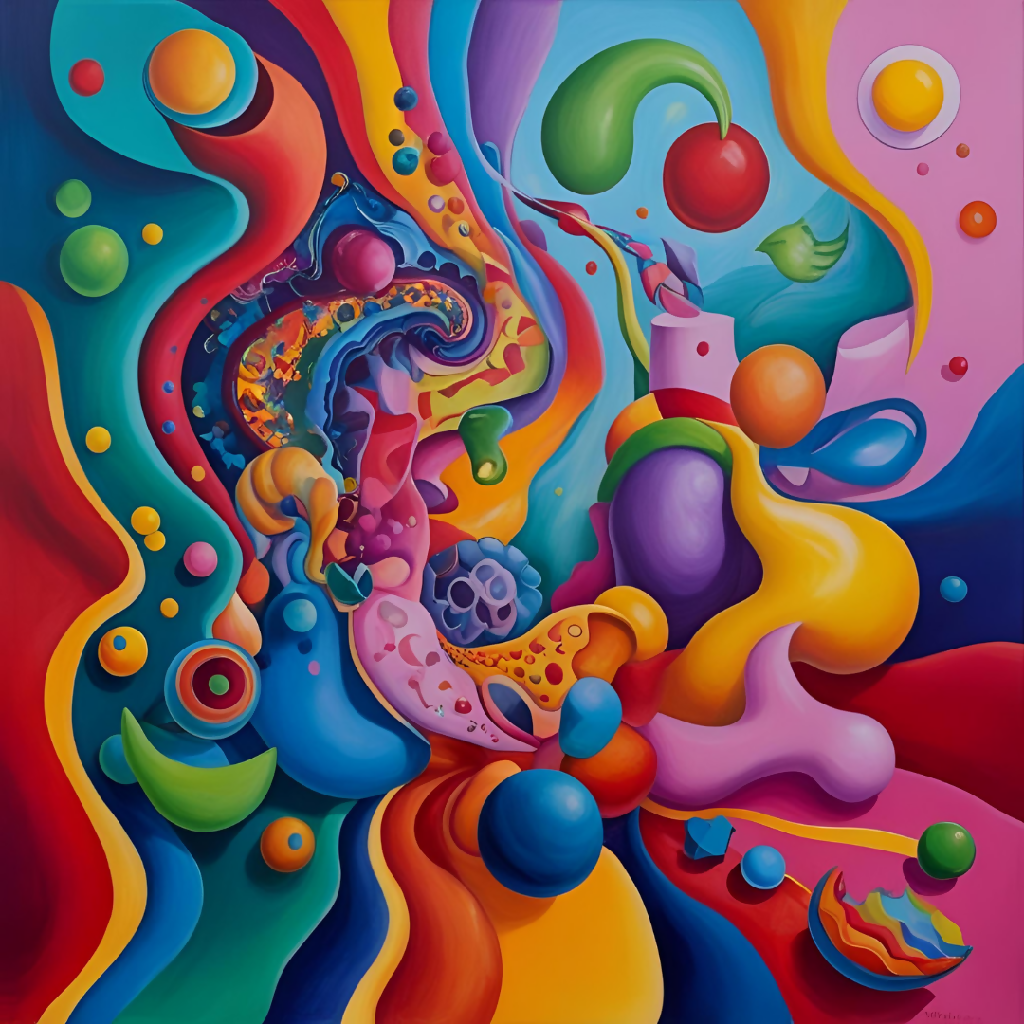 "Cosmic Carnival" is a vibrant explosion of color and form, blending surrealism with playful abstraction. Swirling ribbons of bright hues twist and dance across the canvas, interspersed with floating spheres, whimsical shapes, and dynamic curves. The composition evokes a sense of joyful chaos, as if the viewer has been swept into a fantastical universe where energy and imagination reign. Each element seems to move and interact, creating a lively visual rhythm that invites the eye to explore every corner of this exuberant, dreamlike world.