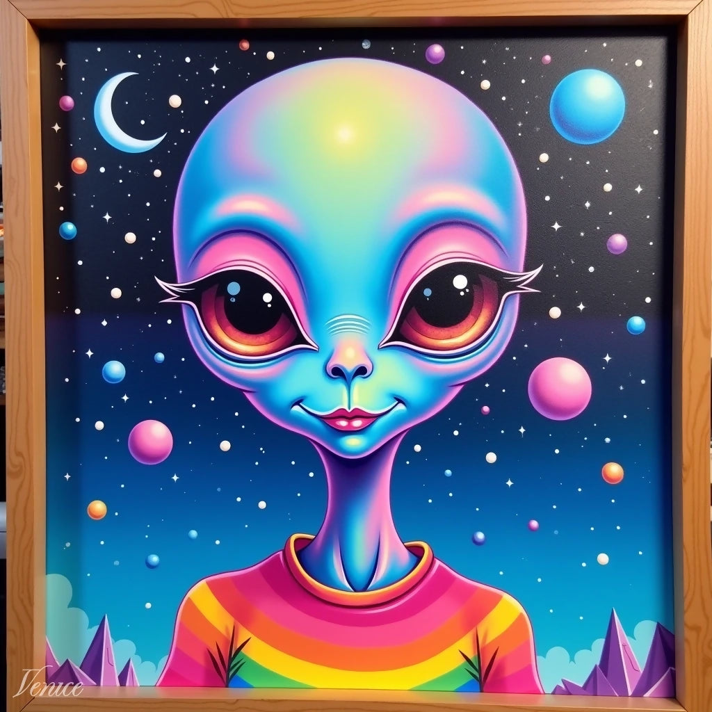 A vibrant artwork featuring a colorful alien figure with large eyes, set against a cosmic background with stars, planets, and a crescent moon, wearing a rainbow-striped shirt.