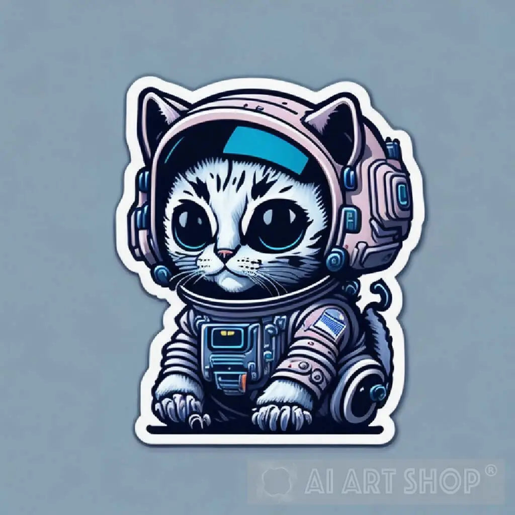 "Step into a retro-futuristic world with 'Cosmic Feline: A Synthwave Adventure', featuring a cute vector astronaut kitten sticker with a white border on a light gray background. This adorable space explorer is on a mission to explore the outer reaches of the galaxy, with a vintage synthwave soundtrack setting the mood for an epic journey through the stars. The perfect addition to any collection, this sticker captures the spirit of the synthwave era while adding a touch of whimsy with its charming feline protagonist. Let Cosmic Feline take you on a journey to the stars and beyond!"