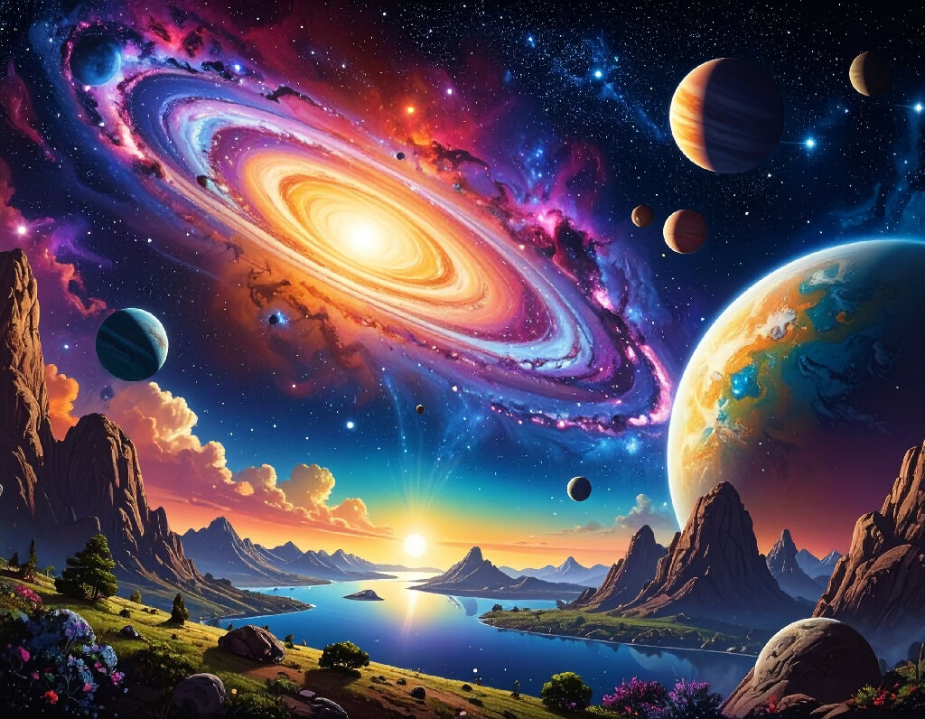 A stunning fantasy artwork of a glowing spiral galaxy illuminating a surreal alien world. Majestic mountains, distant planets, and a vibrant cosmic sky create a breathtaking sci-fi scene full of mystery, wonder, and interstellar beauty.
