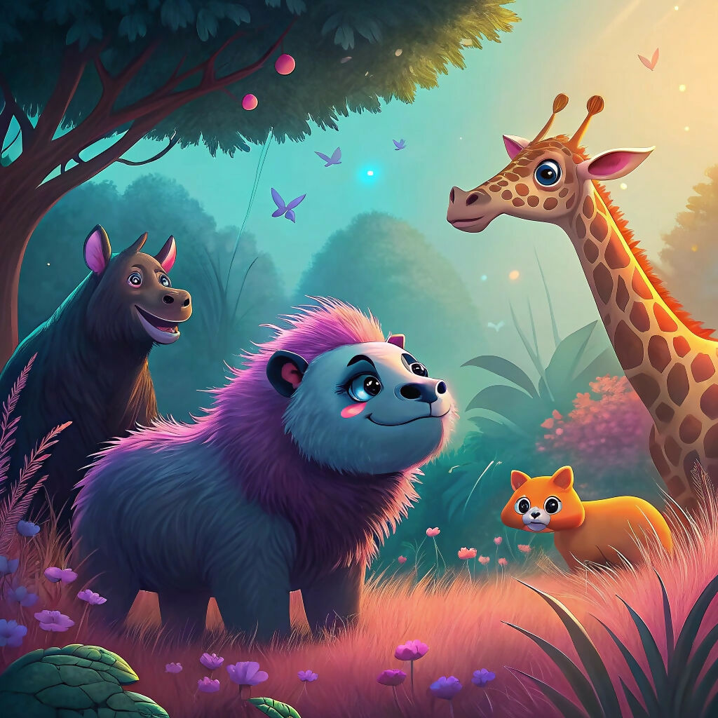 A vibrant digital illustration depicts a whimsical woodland scene.  A large, light-brown giraffe with prominent spots stands in the mid-ground, its head tilted inquisitively.  A slightly smaller, pinkish-purple creature resembling a panda,  with large, expressive eyes and a friendly face, stands beside a dark brown, hippo-like animal that appears curious.
