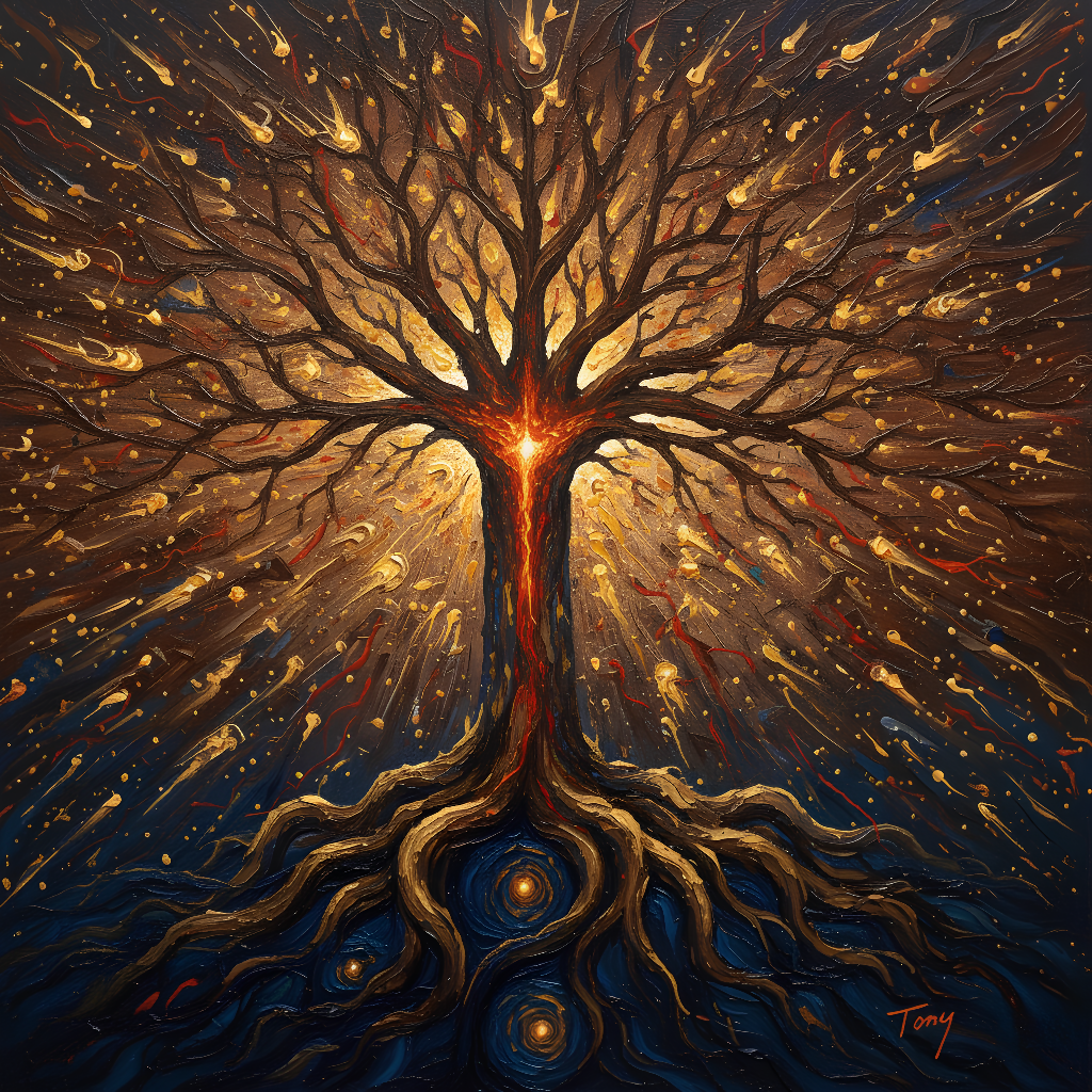 Entropy: Observe the explosion of the branches and the Burnt Umber. This represents the exhilarating, frightening, and necessary forces of change, expansion, and dissolution. The shattered, aggressive impasto evokes raw energy, freedom, and the beautiful, terrifying process of letting go.
