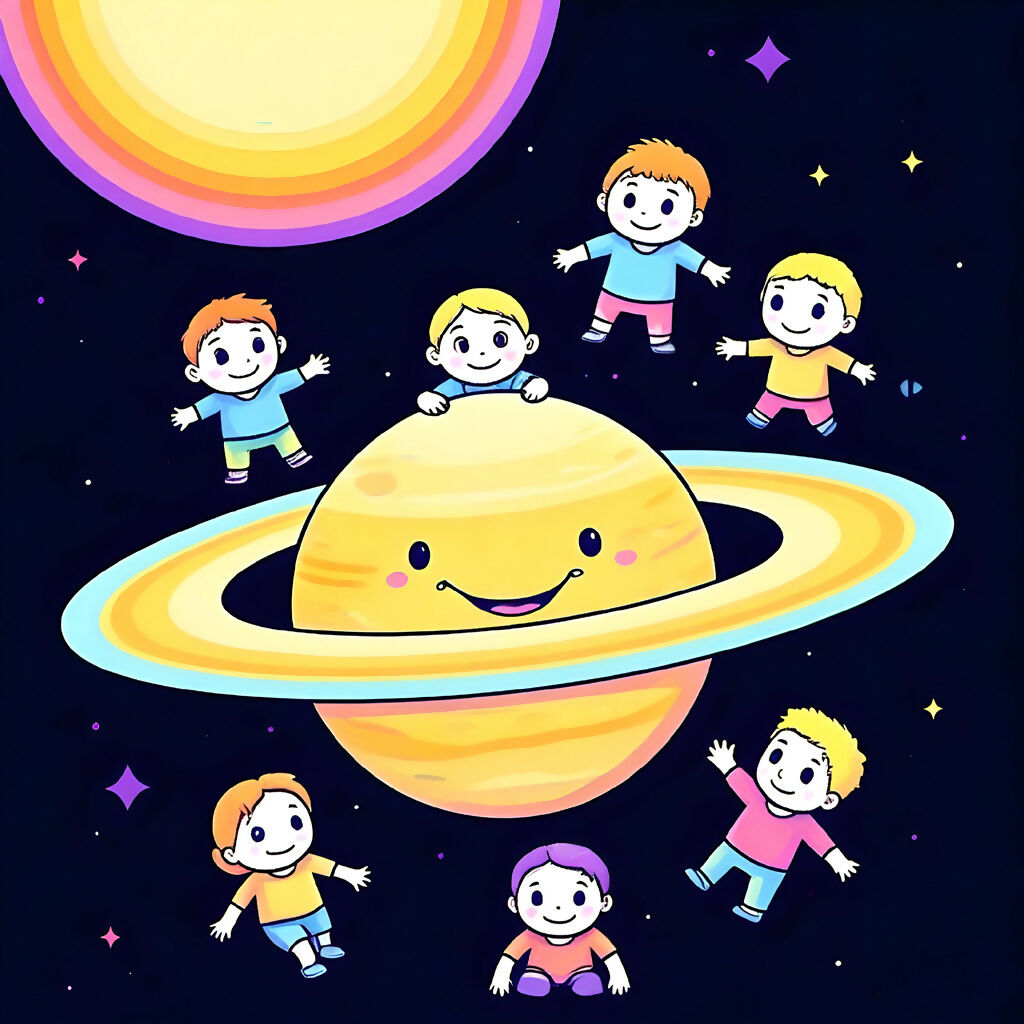 Step into a playful cosmic adventure with Cosmic Kids: Saturn’s Joy! This AI-generated artwork presents a cheerful Saturn with wide, expressive eyes, surrounded by delighted children floating through space. The vibrant color palette and whimsical composition bring an imaginative twist to the wonders of the universe, making it a perfect piece for children's spaces, educational materials, or anyone who enjoys lighthearted celestial art. With a radiant sun glowing above and twinkling stars decorating the dark backdrop, this artwork beautifully blends fantasy with the excitement of exploration.