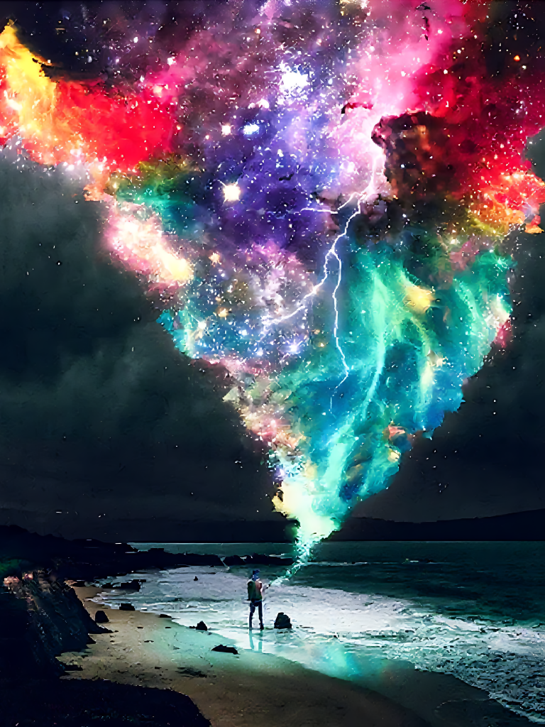 Lose yourself in the magic of our Cosmic Lightning Storm Digital Art. This captivating digital download captures an awe-inspiring moment where a colorful, galactic storm lights up a dark night sky over a tranquil ocean. It’s a powerful and breathtaking piece of fantasy art that feels both epic and serene.