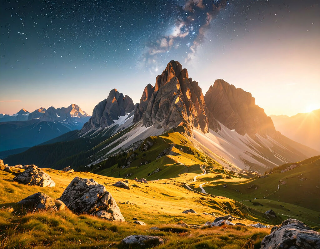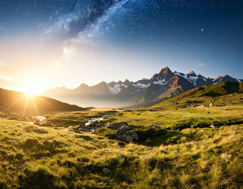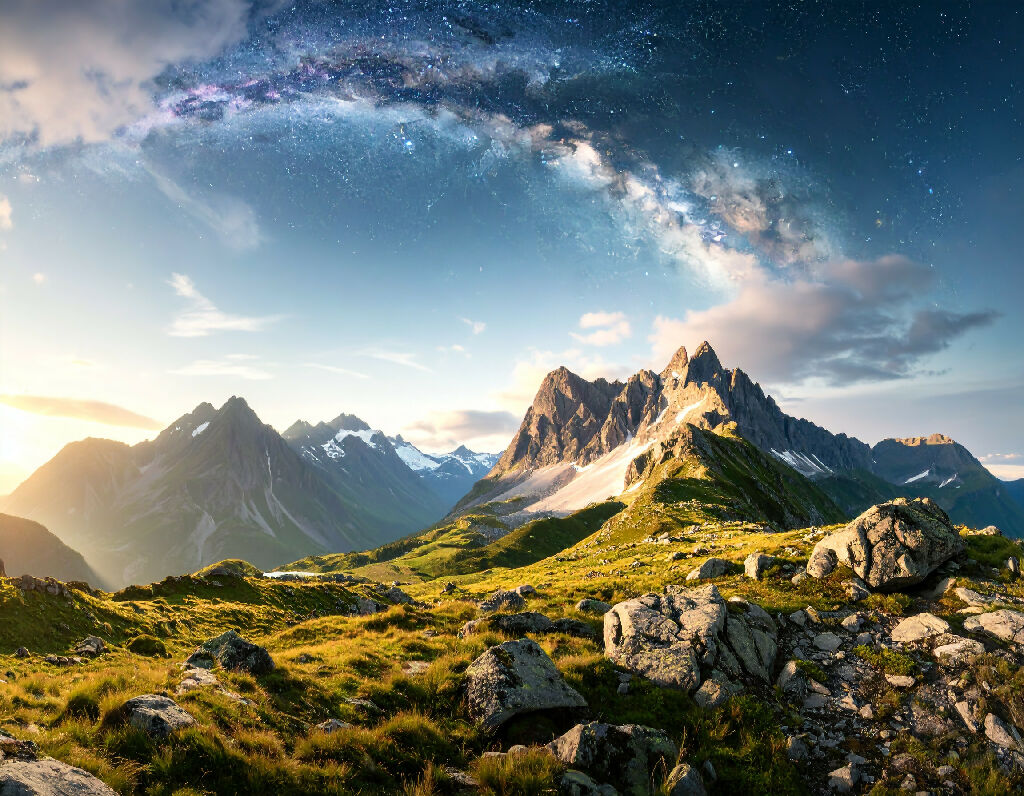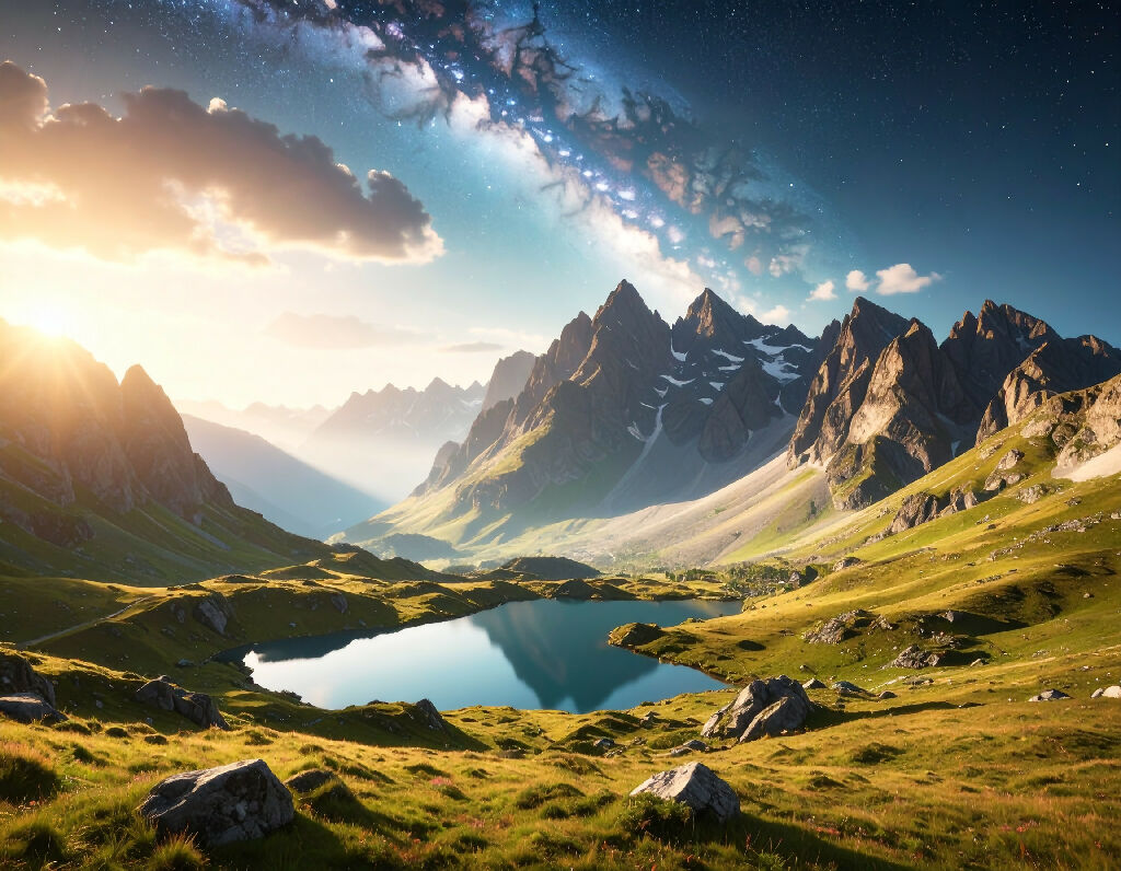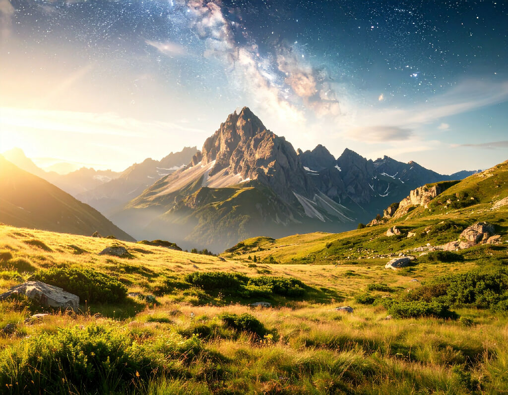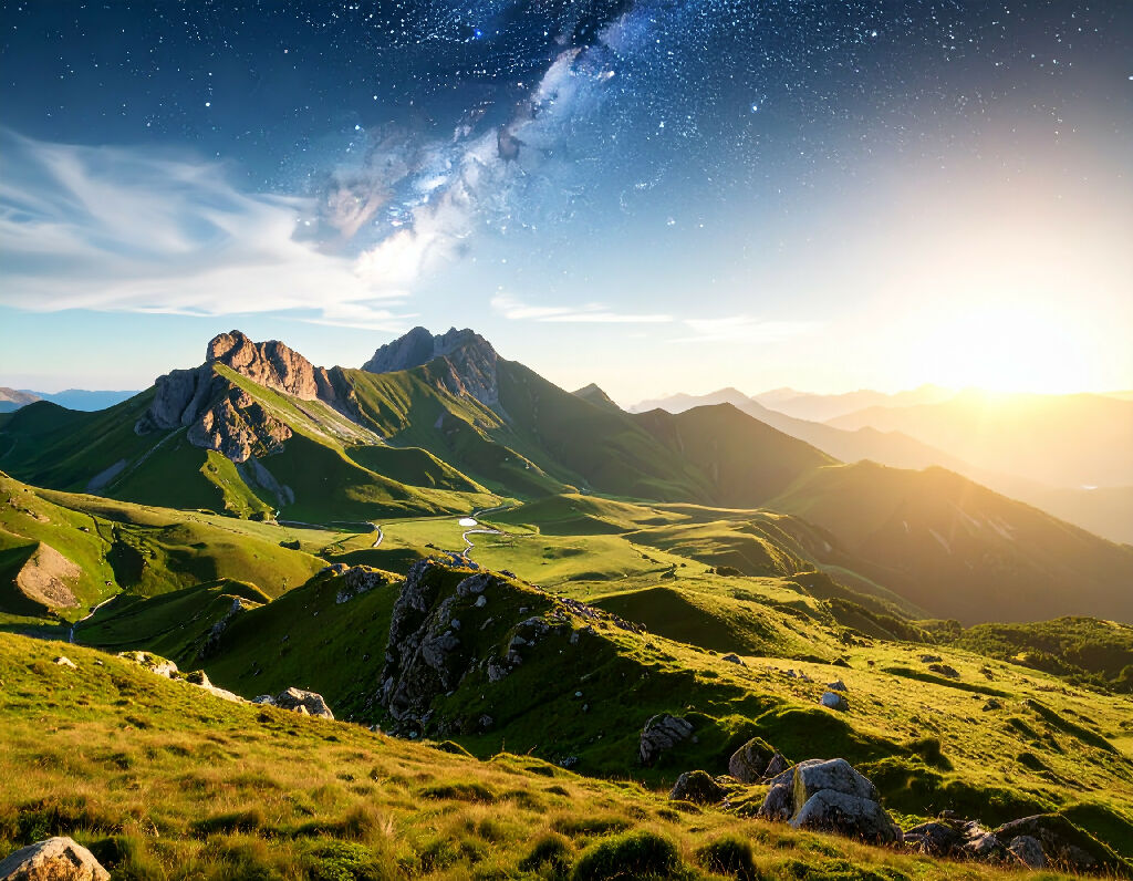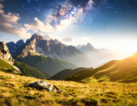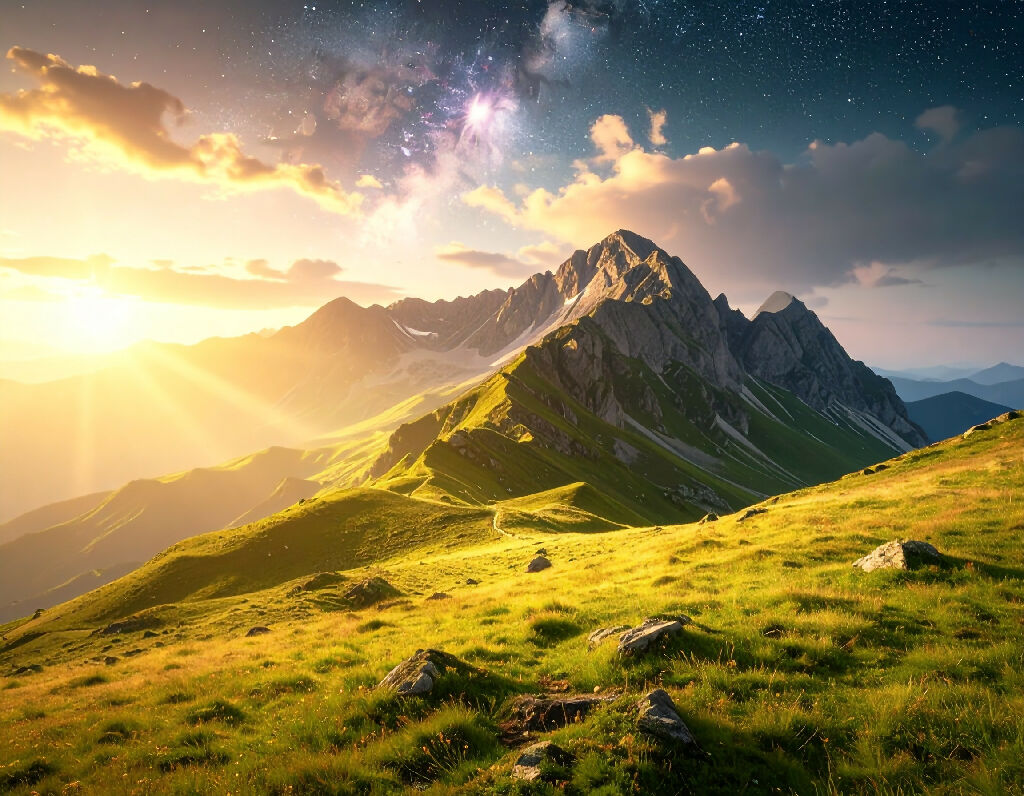 surreal mountain range glowing under a starry galaxy sky, ethereal light beams, photorealistic landscape, ultra detailed, fantasy atmosphere