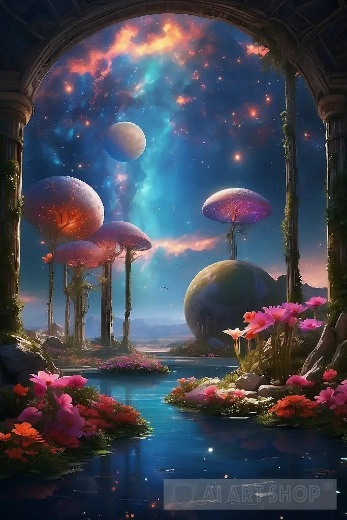 Glowing mushrooms sprout amidst vibrant flowers in a fantastical garden beneath a swirling galaxy.