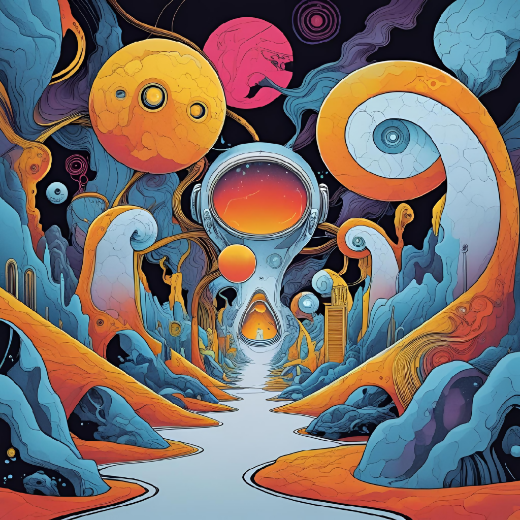 This surreal artwork depicts a dreamlike journey through an alien landscape. Towering, organic structures in vibrant hues of blue and orange dominate the scene, leading the eye towards a distant figure at the end of a receding pathway. A stylized astronaut's helmet floats in the foreground, reflecting a fiery sunset and suggesting a spacefaring theme. Planets of varying sizes and colors hang in the inky sky, adding to the overall sense of wonder and otherworldly exploration. The illustration evokes a sense of mystery and adventure, inviting the viewer to ponder the possibilities of the universe and the nature of existence.