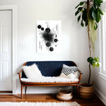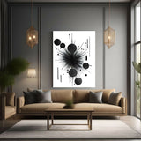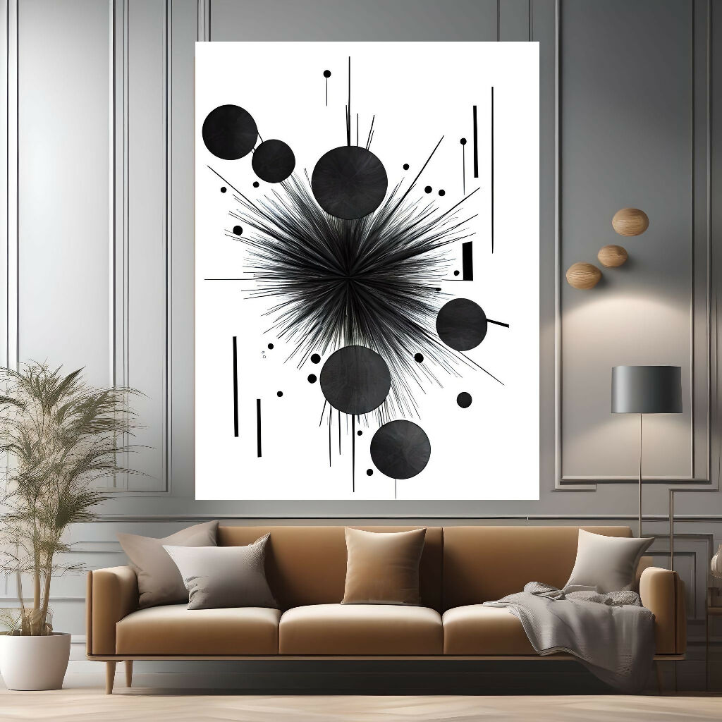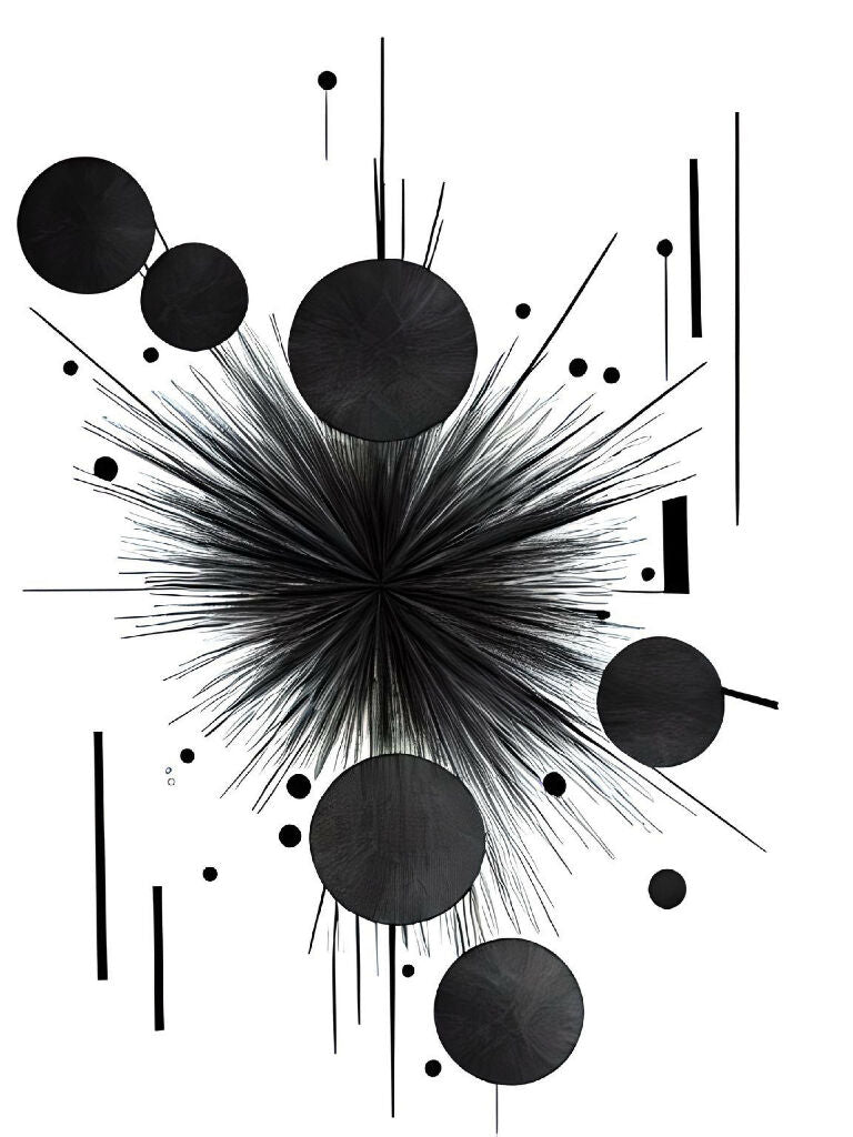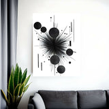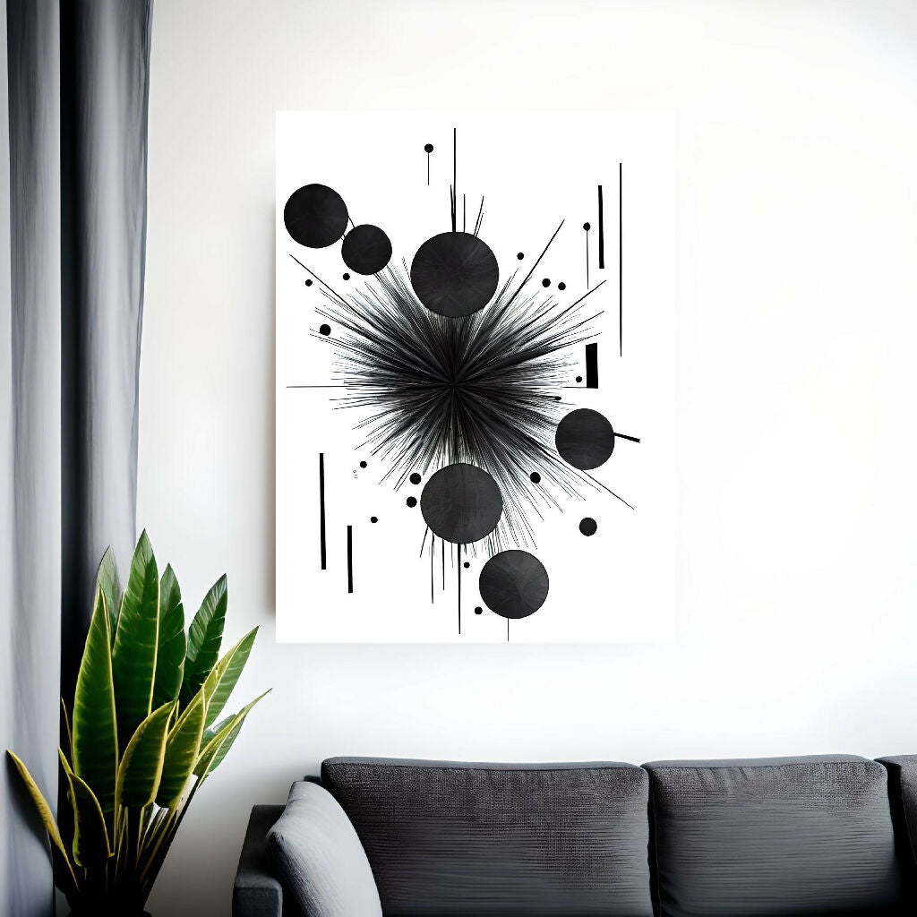 A group of celestial bodies circling a burst of cosmic energy in this black and white modern art ai painting.