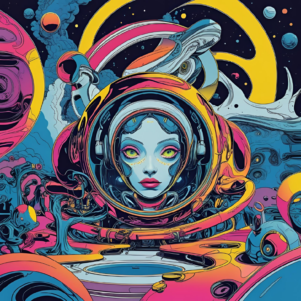 A vibrant and surreal artwork featuring a woman in a stylized spacesuit, her pale face contrasting with bold, psychedelic colors. The piece is set against an abstract cosmic backdrop filled with swirling nebulae, orbiting planets, and geometric shapes. The image evokes a sense of nostalgia for retro-futuristic aesthetics, blending elements of vintage sci-fi with a contemporary, eye-catching color palette.