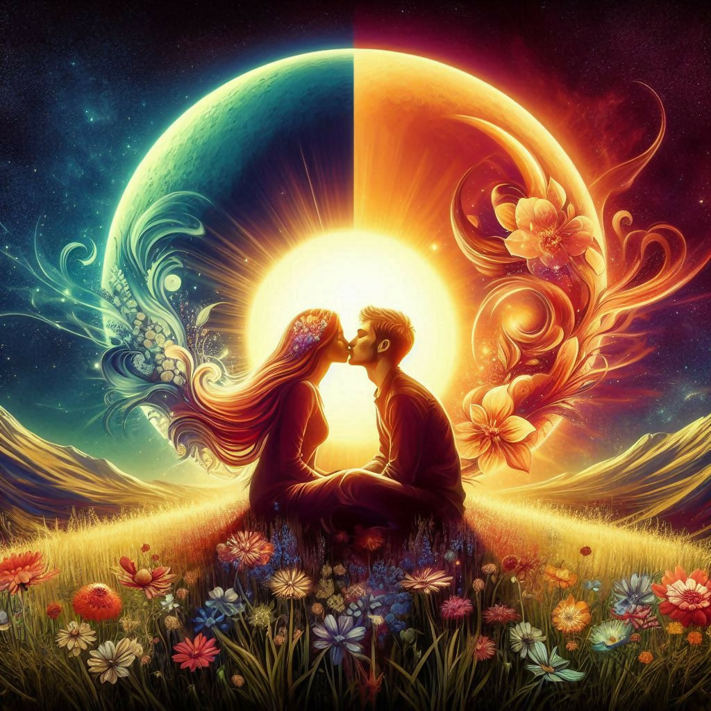 Beneath this cosmic embrace, a couple sits together on a peaceful landscape, lost in a moment of pure affection. Their kiss and gentle embrace reflect the deep, unspoken connection between two souls, mirroring the harmony of the celestial bodies above. The surrounding scenery glows with soft hues, blending the golden warmth of the Sun with the Moon’s soothing silver light, creating an ethereal dreamscape.