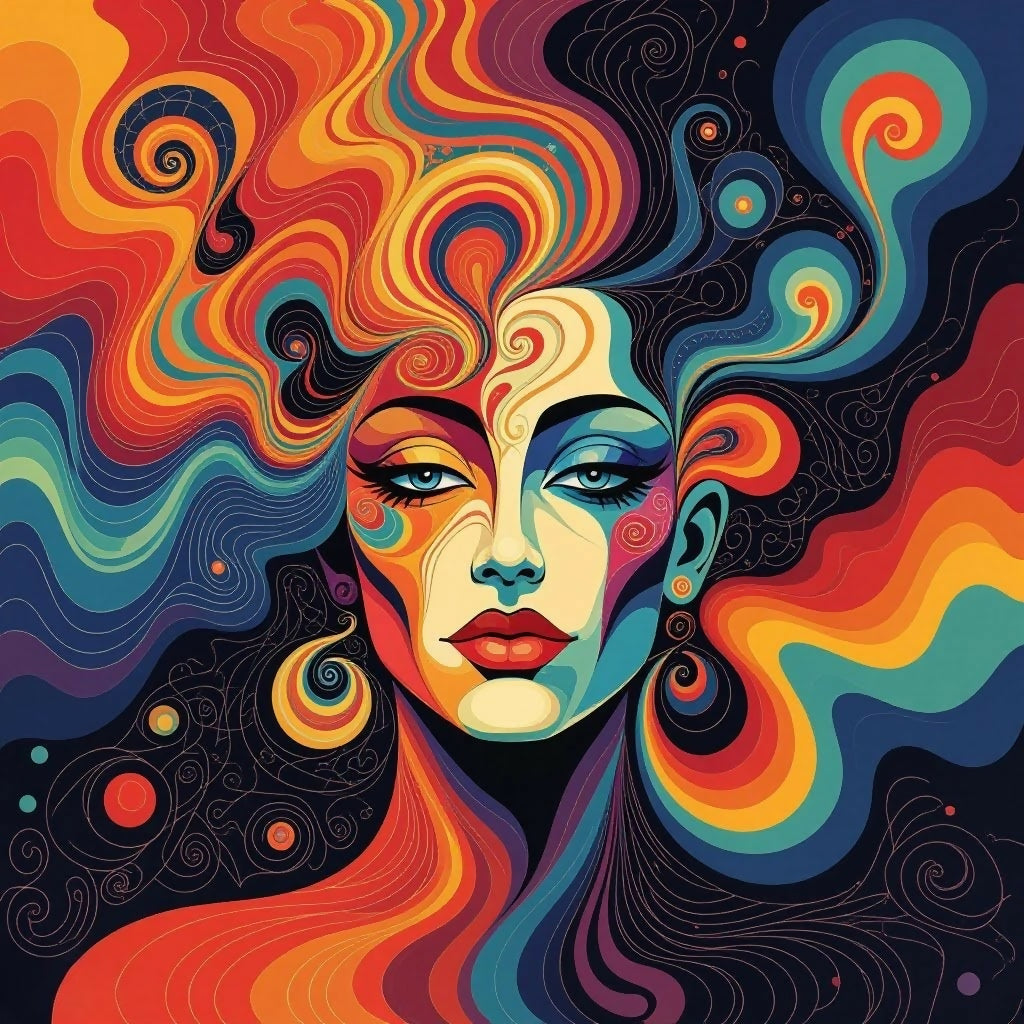 This mesmerizing AI-generated artwork showcases a stylized female face with flowing, multicolored hair swirling in vibrant hues of red, orange, blue, and green against a cosmic dark background. Intricate patterns and spiral designs enhance the otherworldly aesthetic, making it a perfect statement piece for any art enthusiast or modern decor.